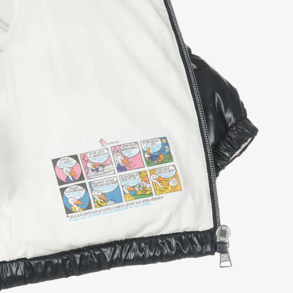 A dark blue two-piece snowsuit for little boys and girls by Moncler Enfant. This set is down-filled and jersey lined for comfort, with a silky water-repellent exterior for protection in rain and snow. The salopettes have stretchy shoulder straps and elasticated trims. The matching jacket has popper-fastening pockets and a hood with a silver logo trim. Both items fasten with a zip and feature the brand's signature logo badge.