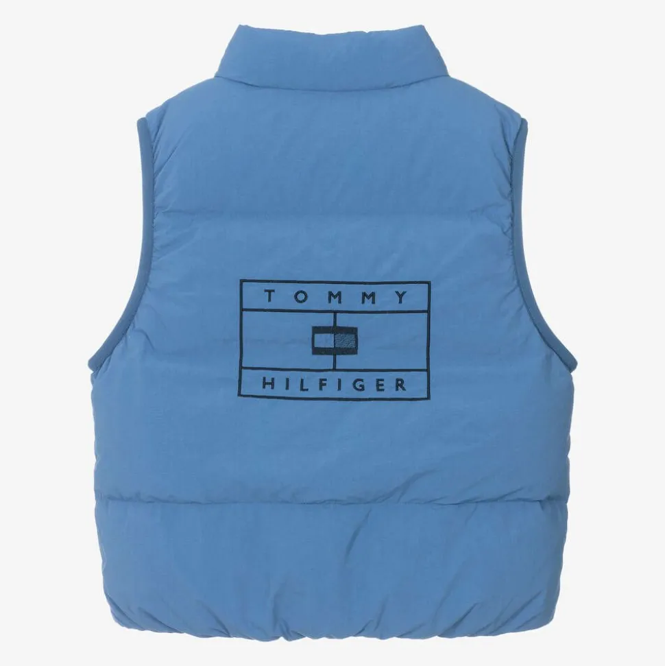 A blue, zip-up gilet for boys and girls by Tommy Hilfiger, padded for warmth in soft down. Great for layering, it has a high neckline, elasticated hem and popper fastening pockets. For a distinctive look, the brand's logo is embroidered on the back in navy blue and a small flag logo can be seen on the chest. The outer material of this product is made from at least 95% recycled materials.