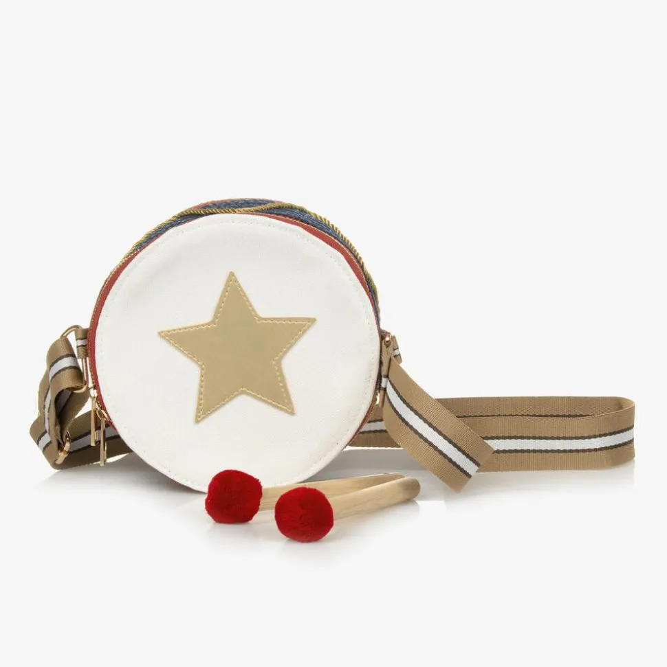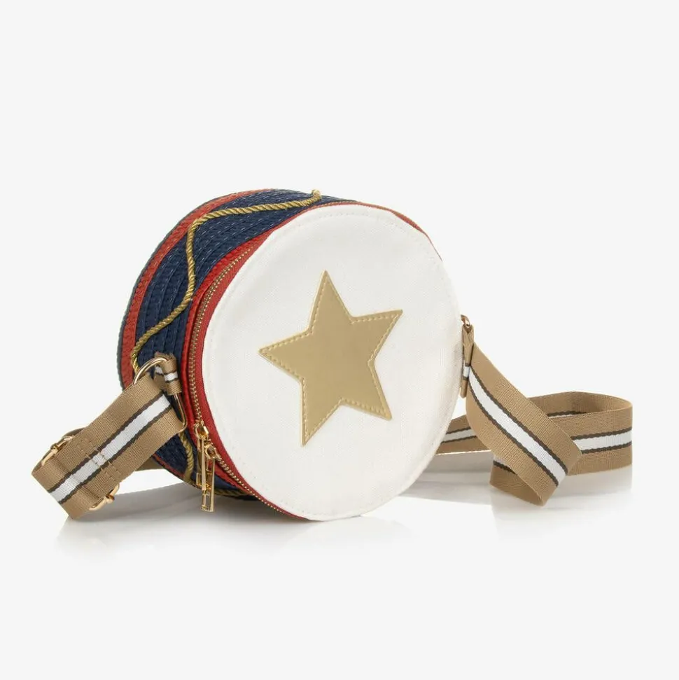 Charming blue drum bag for boys and girls by Meri Meri, woven in paper. The compartment secures with a zip fastening and opens to reveal two wooden drumsticks for creative role-play that are attached by red ribbon. To ensure a comfortable fit, the striped grosgrain strap is adjustable for across body wear.