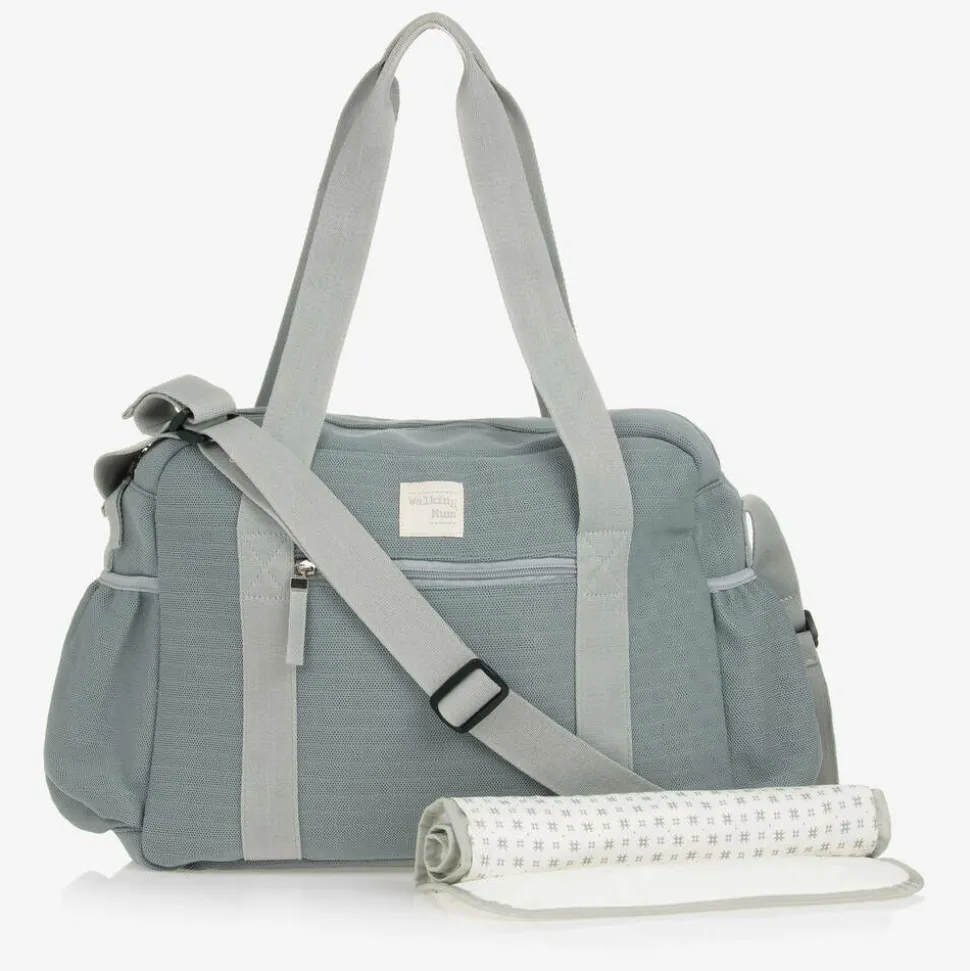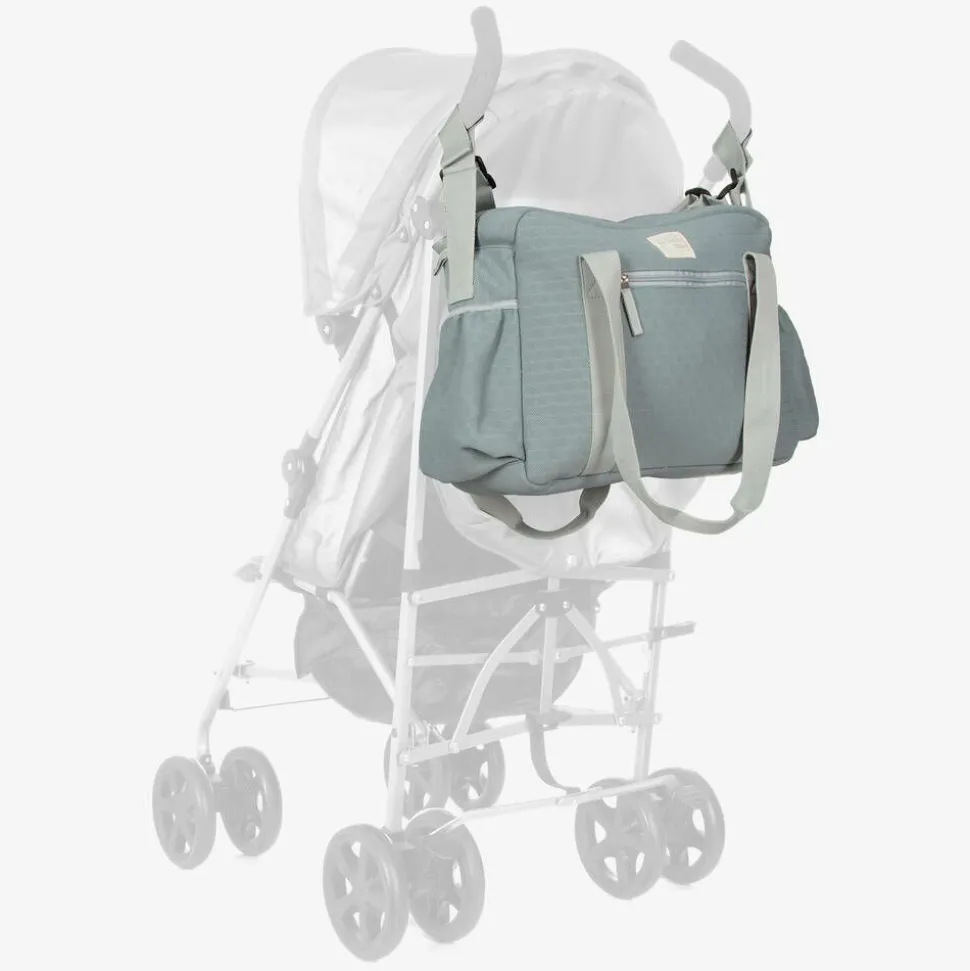 Practical slate blue changing bag by Pasito a Pasito Walking Mum, in a lovely soft mesh knit. It has a spacious, cotton lined main compartment with a front pocket, zip fastenings and two external side pockets. There are further pockets inside, including an insulated bottle pocket and a plastic zipped pocket handy for transporting wet clothes. The woven shoulder strap is adjustable and attached, and comes with two velcro buggy straps. Eco friendly, the durable fabric is made from post-consumer materials, free from harmful azo dyes and noxious substances. It comes with a lightly padded, easy-wipe changing mat.