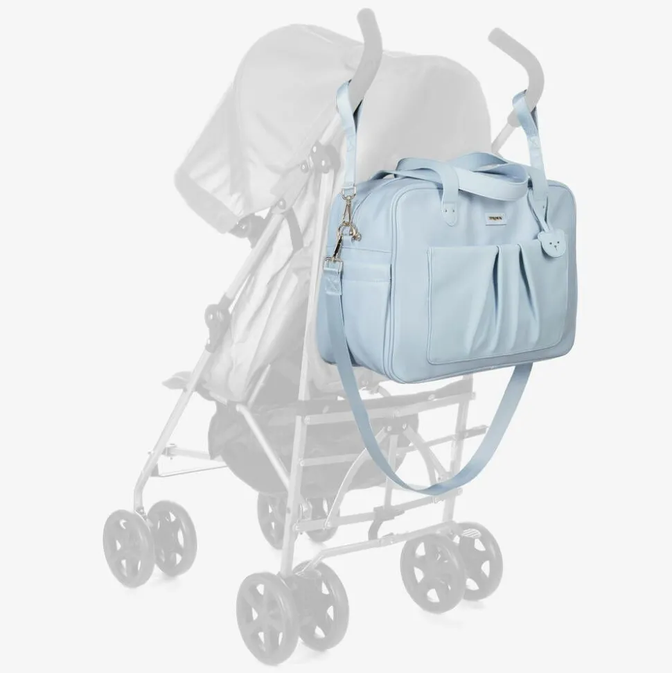 Pale blue faux leather changing bag by Mayoral, with golden metal hardware and a cute teddy bear charm. Soft yet sturdy, it has a ruched popper-closing outer pocket and logo patch above, both made in soft canvas-effect fabric for an interesting multi-textural finish. This versatile bag can be carried with the detachable shoulder strap, stored on the stroller using the buggy straps, or held with the carry handles. Lined with soft twill, there are handy interior and exterior pockets for storing baby essentials.