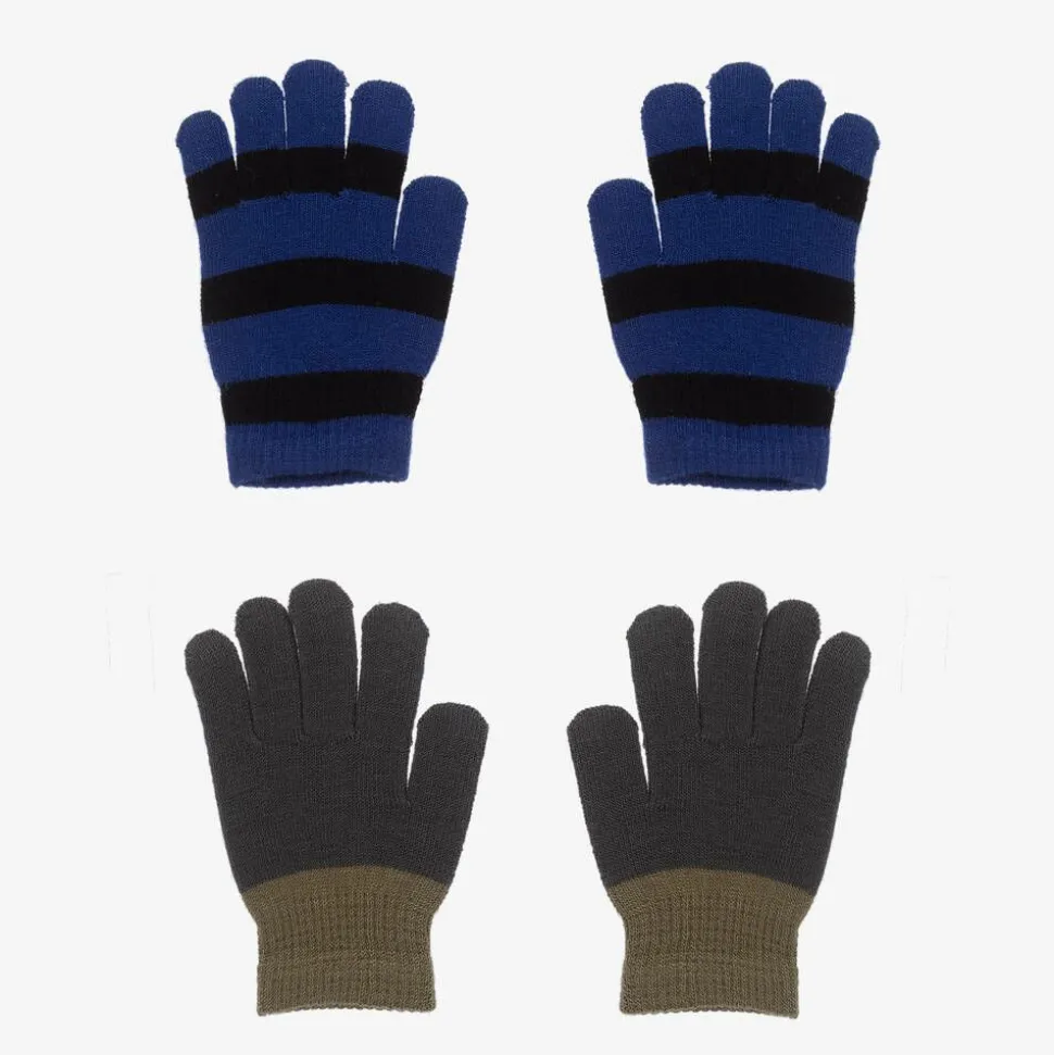 In a useful pack of two, these gloves for boys and girls are by Molo. One pair has blue and black stripes and the other has a colourblock design in different shades of khaki green. Made from a soft knit, they are ideal for keeping hands warm in colder temperatures.