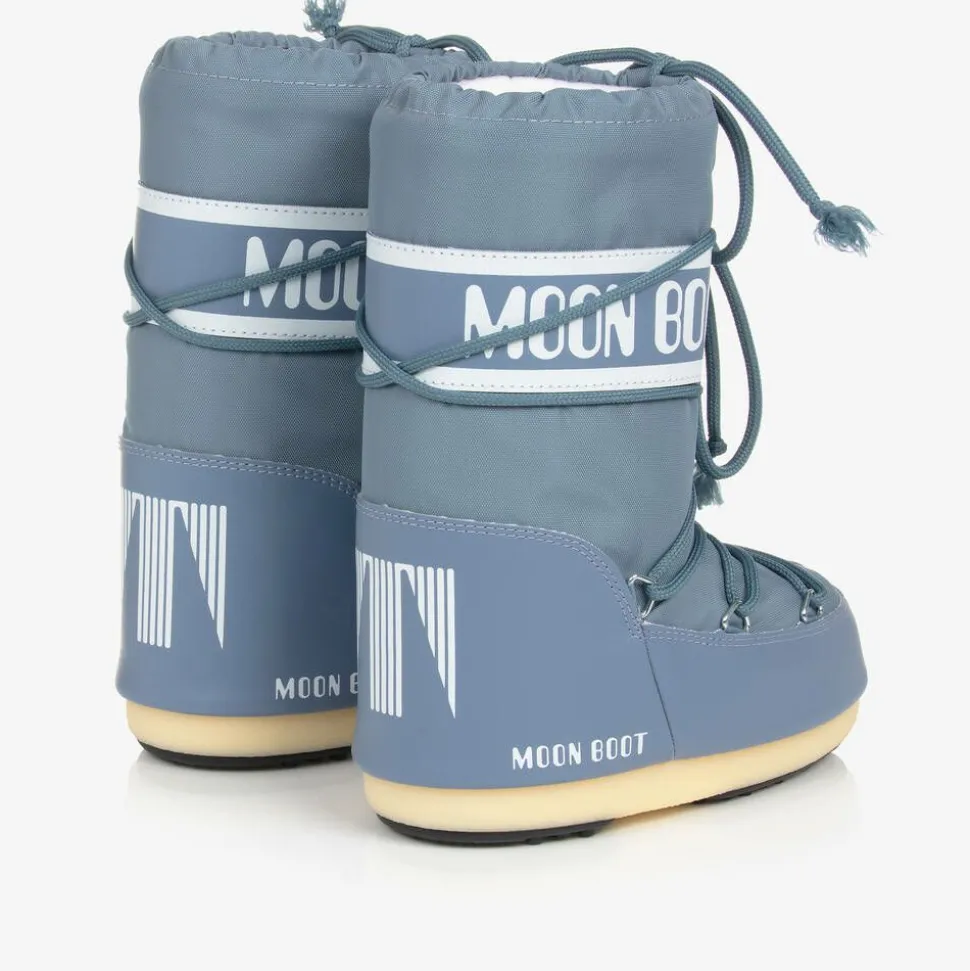 Stylish grey-blue long snow boots for boys and girls by Italian brand Moon Boot. Designed in the signature original style with bold white logo prints, they are heavily padded and ultra resistant, with faux leather trims and decorative laces. There is a drawstring tie on the cuffs ensuring a warm and comfortable fit and the thermoplastic non-slip rubber sole features tiny suction cups for improved grip on slippery surfaces. The technological foam lining will feel snug at first but will mould to the size and shape of the foot after a few hours of wear.