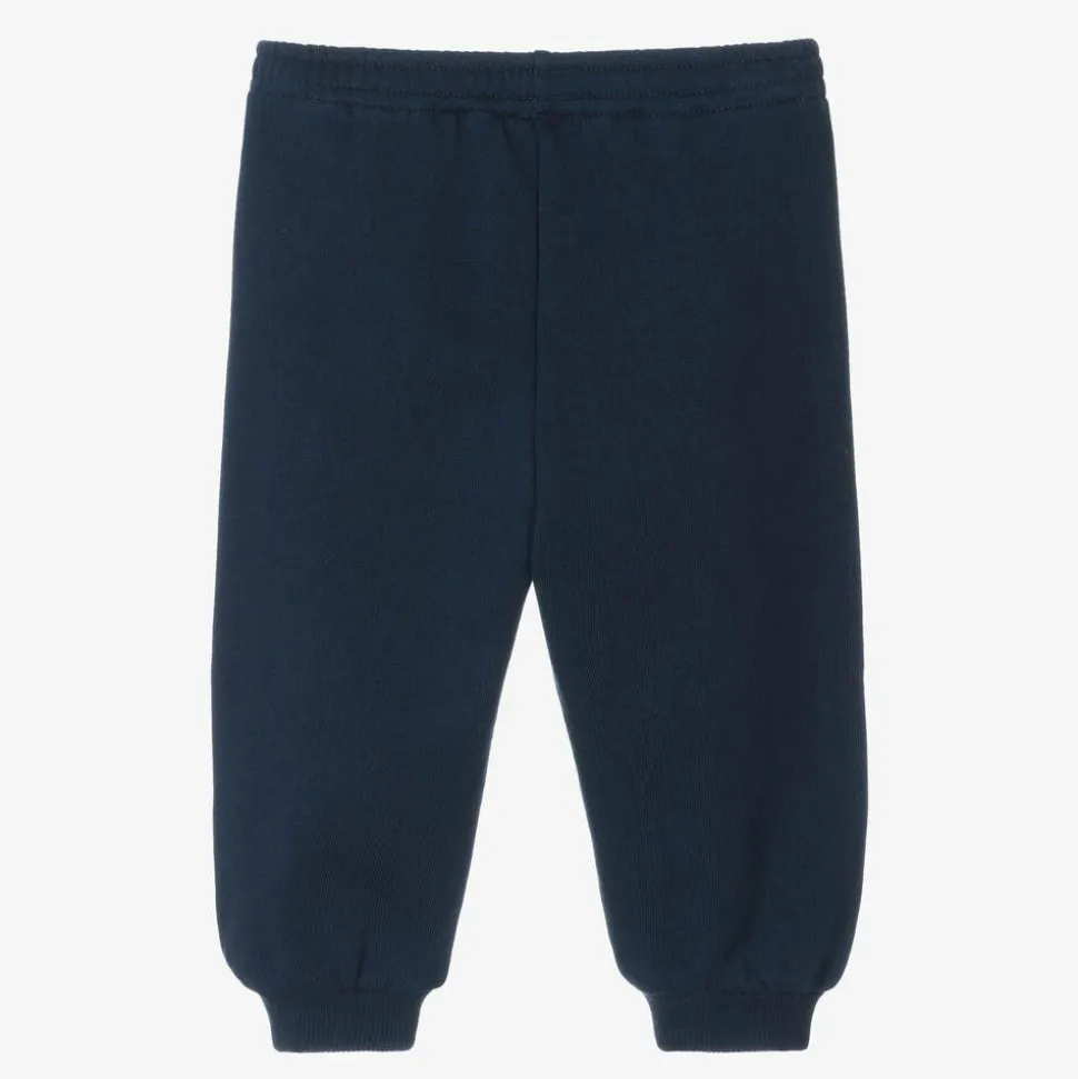 Navy blue joggers for baby boys and girls by luxury Italian designer Gucci, made in the softest cotton jersey. An orange-red Interlocking G logo is featured on the front, alongside the fashion house's green Web for a signature look. These joggers are finished with an elasticated waist and cuffed trims.