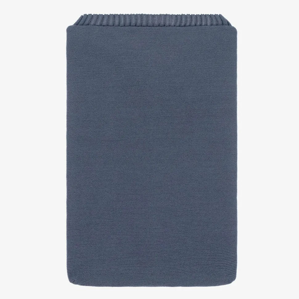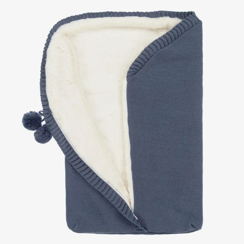 Super snuggly, knitted baby nest for boys and girls by Spanish brand Mebi, in a lovely blue shade. It is lined in luxuriously soft ivory plush faux fur to keep your little one cosy and has a concealed front zip fastening. There are ribbed trims and decorative pom-poms on the front.