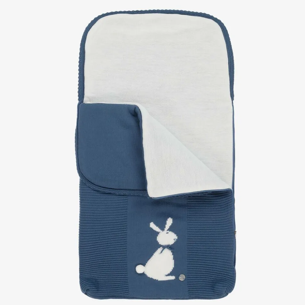 Cute blue knitted nest for baby boys and girls from ArtesanĂa Granlei. Lightly padded for added warmth and comfort, this lovely nest has a white bunny motif on the front finished with an adorable pom-pom tail and string bow. The side zip fastening makes getting your little one in and out quick and easy.