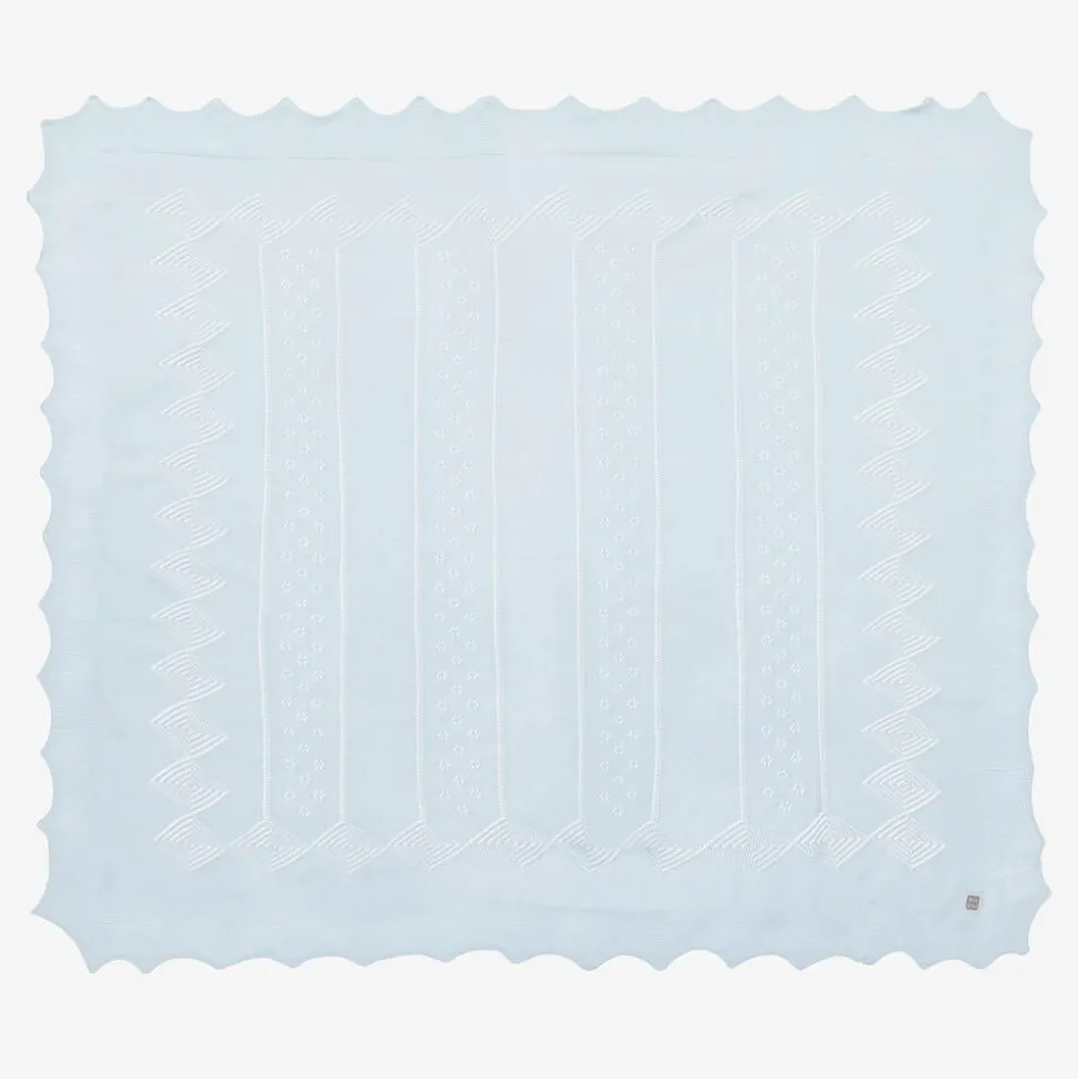 A lightweight pale blue shawl for baby boys and girls by Spanish designer Minutus. Finely knitted with a delicate pattern, it has gently scalloped edges. Lovely for wrapping and presenting baby, it can also be used in the nursery or stroller.