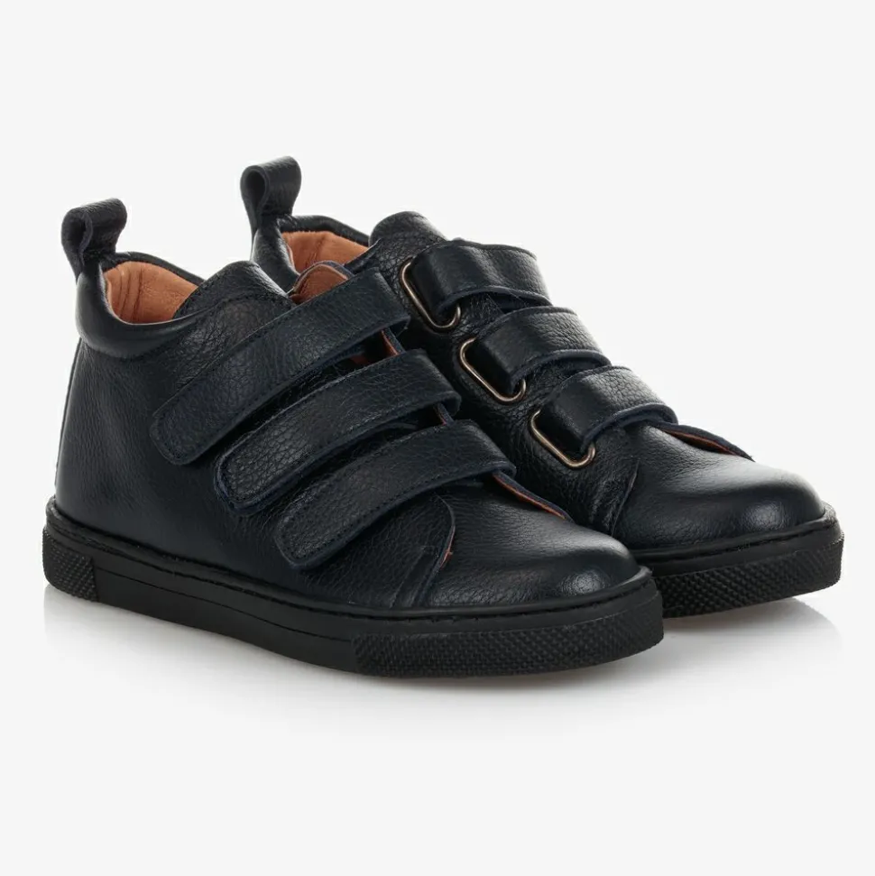Boys and girls navy blue leather high-top trainers from Children's Classics, exclusive to Childrensalon. They have a soft leather lining and a shaped leather inner sole. There are velcro fastening straps over the foot and a black non-slip rubber outer sole.