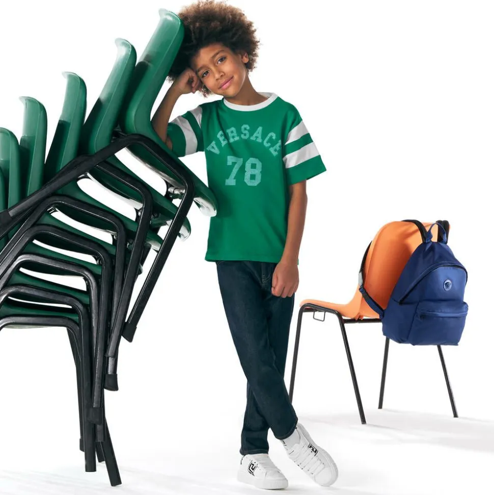 Royal blue backpack for boys by luxury Italian brand Versace, made in silky smooth fabric, with black leather trims. The spacious main compartment has a slip pocket inside, ideal for a laptop and fastens with a zip across the top. There is a zipped pocket on the front and a useful carry handle with a jacquard Greca pattern. The back is made of breathable mesh and is padded for comfort and the shoulder straps are adjustable. For a statement designer finish, this lightweight bag has a blue rubberised Medusa logo on the front.