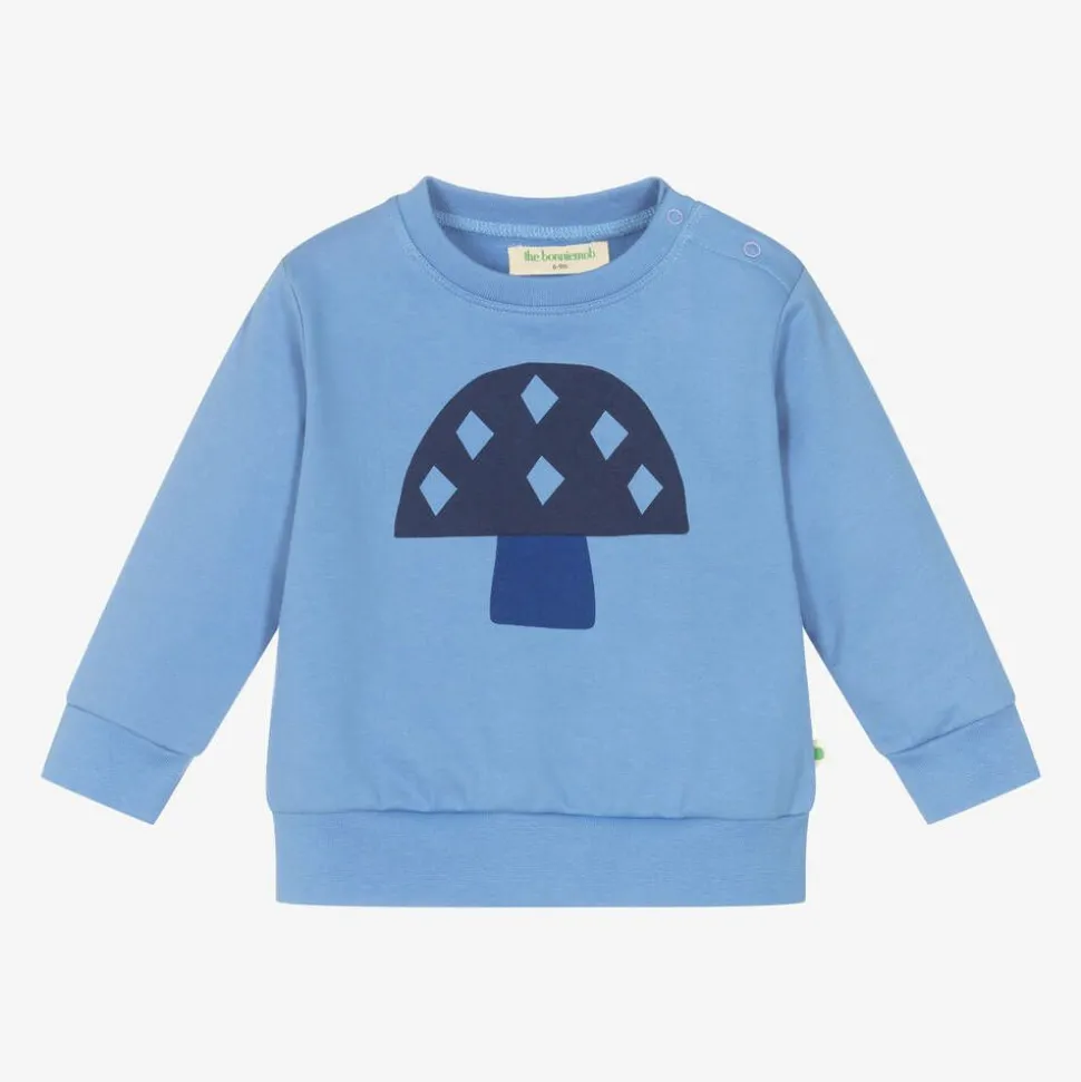 Lovely blue sweatshirt for baby boys and girls by the bonniemob, with a mushroom print on the front in navy blue. Made in soft organic cotton jersey with a cosy brushed feel inside, it has ribbed trims and popper fastenings on the shoulder to help with dressing. For a discreet branded finish, the British label's signature apple logo tab can be seen on the side seam.