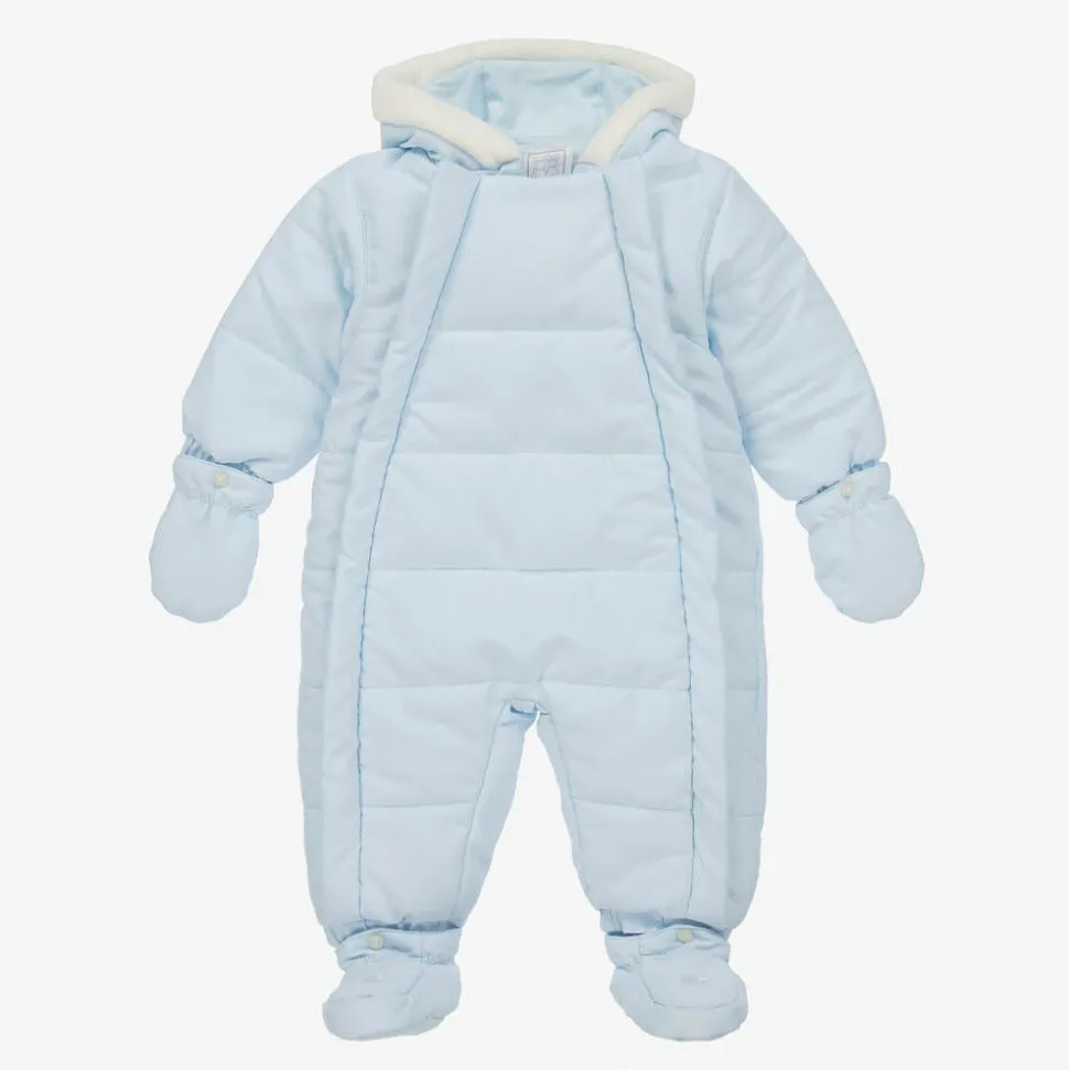 Cosy pale blue snowsuit for baby boys and girls by British brand Emile et Rose, with an ivory faux fur trim around the hood. Warmly padded, it has a comfortable jersey lining and fastens easily with two zips on the front. Attaching with buttons, the removable mittens and booties keep little hands and feet warm. The embroidered logo on one foot adds a cute branded touch.