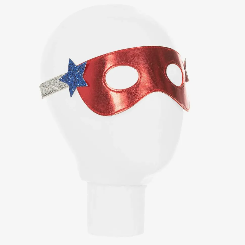 Save the world in this fantastic superhero costume set for boys and girls by Meri Meri. The metallic blue cape is made in shiny lamé and decorated with red and silver appliqués in metallics and sparkly glitter. It has an elasticated neck with a popper fastening. Made in smooth faux leather with glittery trims, the metallic red mask secures with a glittery silver velcro strap, and the two wrist cuffs have elasticated straps.