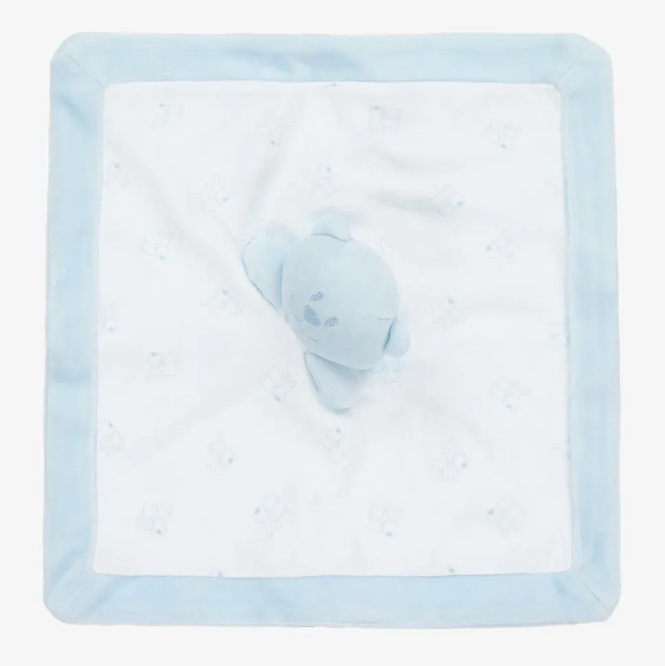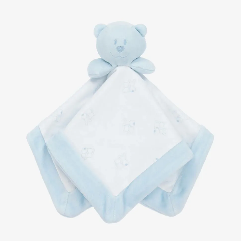 An adorable blue and white doudou for baby boys and girls by Emile et Rose. It has a cute bunny soft toy in the middle, ideal for little hands to hold and a soft cotton jersey panel patterned with teddy bear and bunny motifs. The blue velour trim and lining add softness and a cosy feel to this sweet comforter.