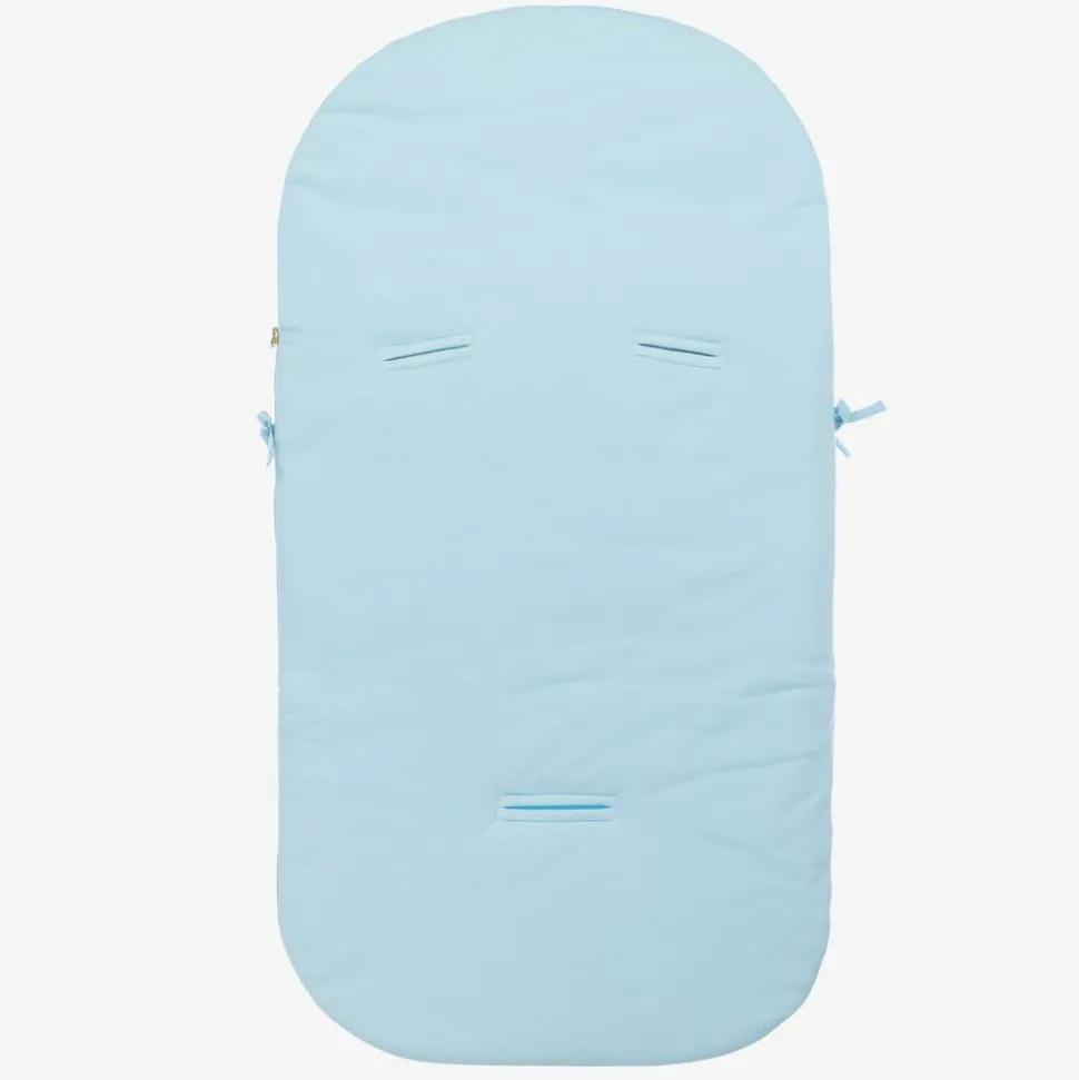 Sky blue nest for baby boys and girls by Moschino Baby, made from cotton jersey for a soft and snuggly feel. Soothing for baby, this padded nest is printed with bold logo lettering and three Moschino Teddy Bear characters. It fastens with a zip down one side and along the base. The white fold-down flap secures with ties at each side and the openings on the back mean it can be easily moved into the car seat or stroller. A black logo patch at the bottom adds further branding.