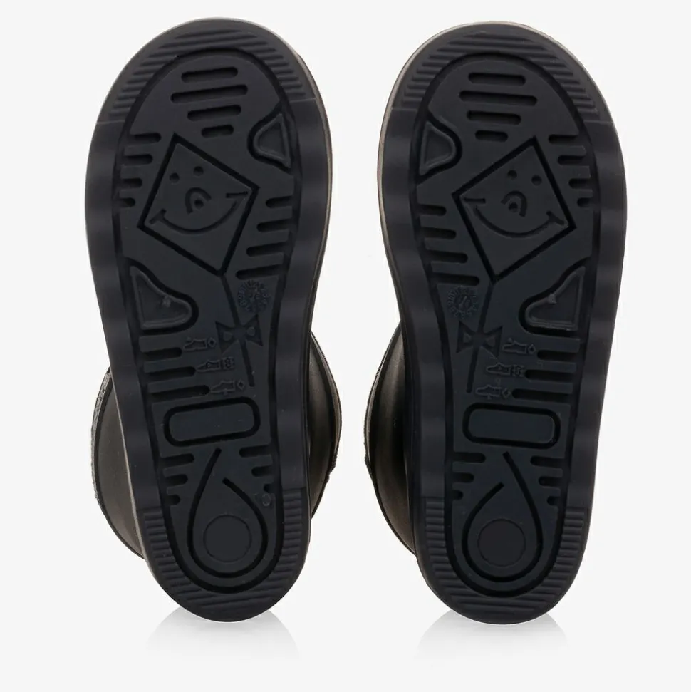 Dark blue thermal rain boots for boys and girls by Danish brand EN FANT, in super flexible eco-friendly rubber. They have a seamless waterproof exterior to keep their feet dry and a reflective logo on the side for high visibility. Warm down to -30*C, they are lined in plush wool with an aluminium membrane for added insulation. They have a good grip on wet and icy surfaces thanks to the non-slip sole.