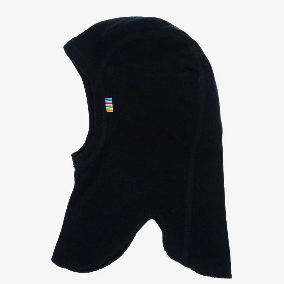 A navy blue balaclava for little girls and boys by Joha. Soft and comfortable, it is made in a thermal, pure Merino wool jersey.