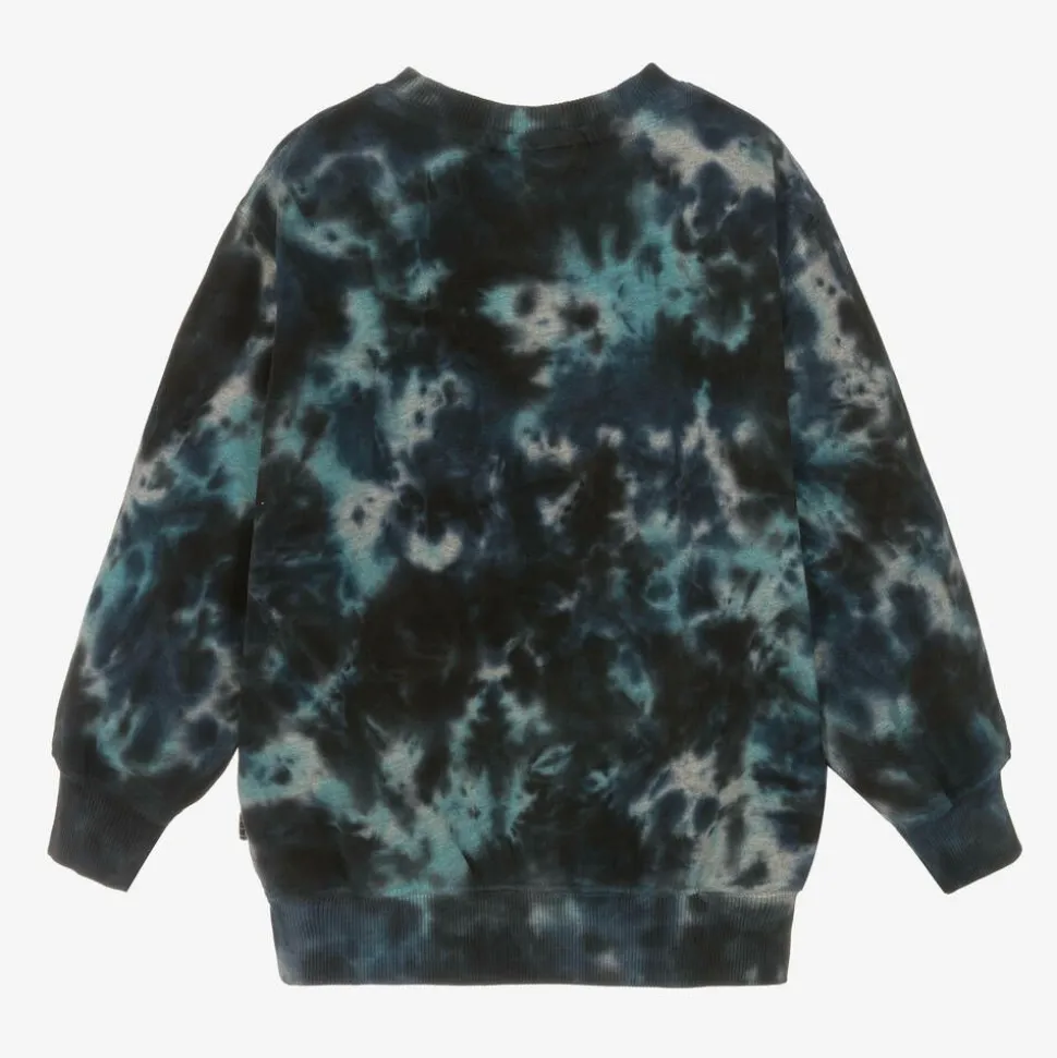 Patterned in a unique blue tie-dye print, this casual sweatshirt for boys and girls is by Danish brand Molo. It is made in soft organic cotton jersey with a warm fleecy inside and gently ribbed trims for cosy comfort. There is a branded tab on one side for a designer finishing touch.