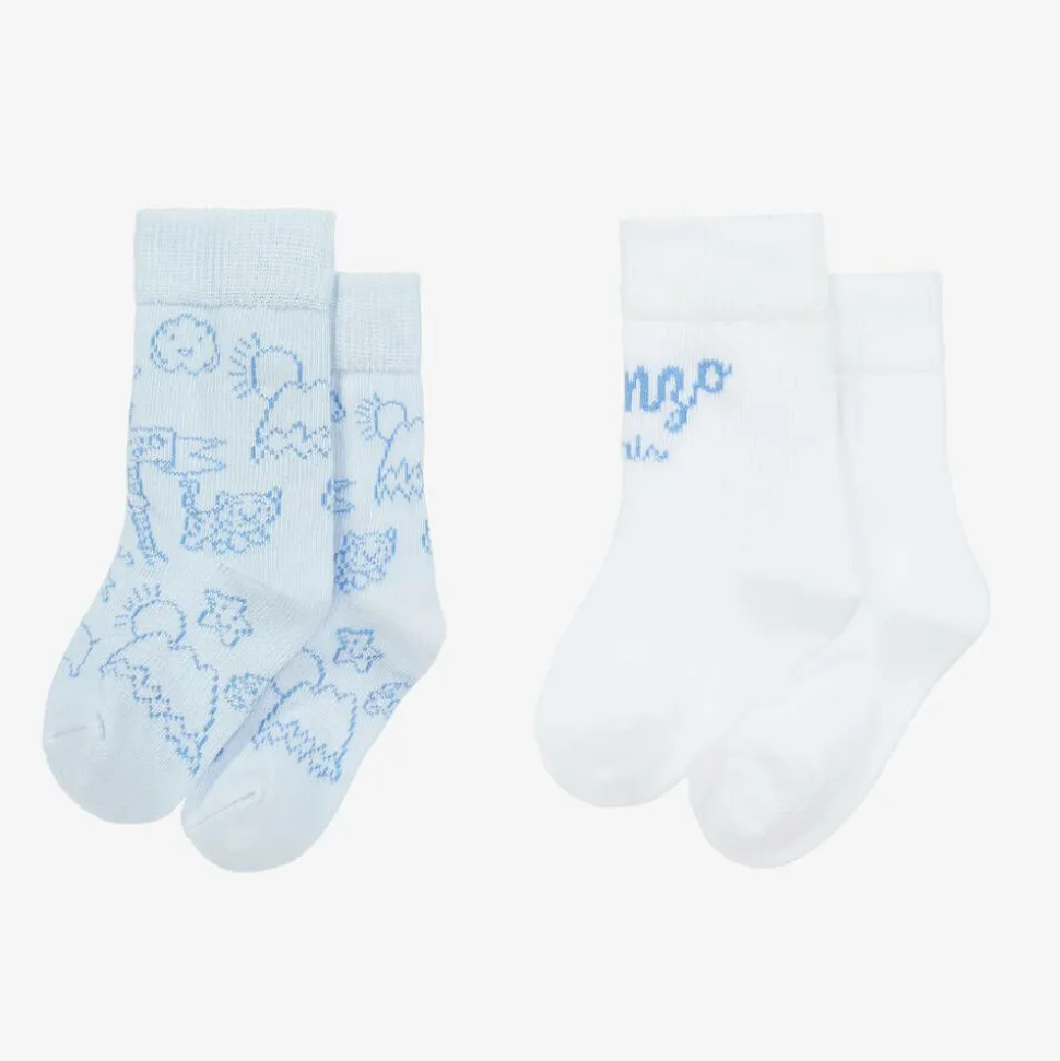 Two pairs of blue and white socks for baby boys and girls by KENZO KIDS, knitted in a soft and stretchy cotton rich blend. The white pair has a blue 'Kenzo Paris' intarsia logo on the front. The pale blue pair has a fun animals and Eiffel Tower themed pattern. Both pairs have cosy ribbed cuffs.