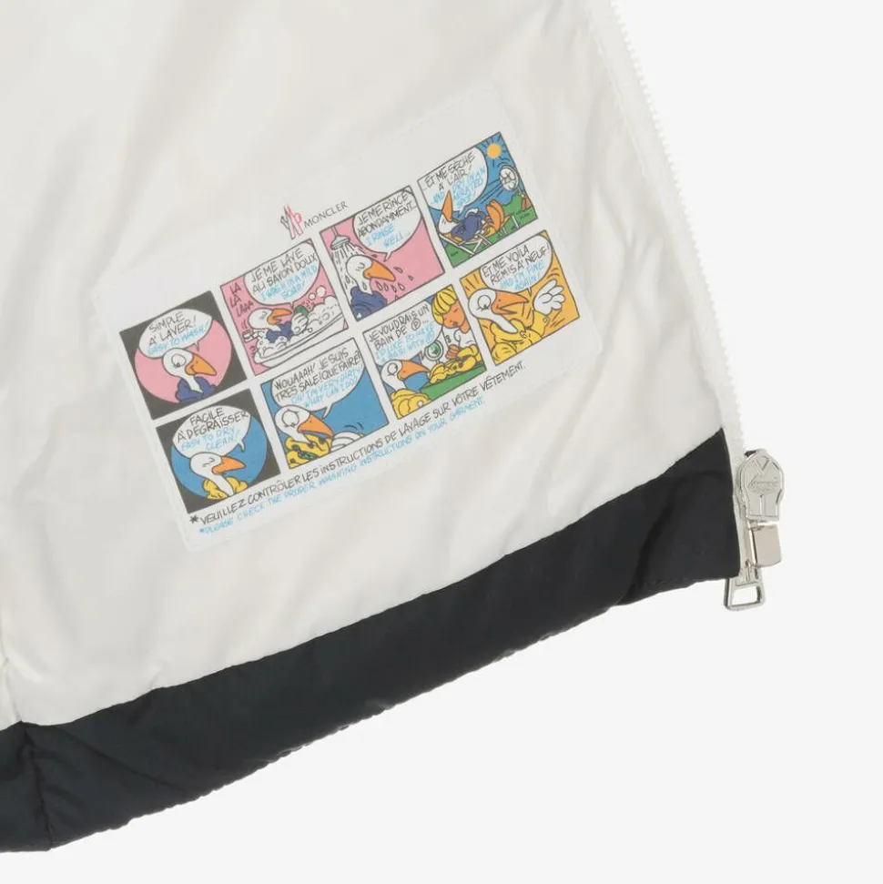 Silky soft with a matte finish, this navy blue puffer snowsuit for little boys and girls by luxury brand Moncler Enfant. Lightweight and water repellent, it is warmly padded in soft down for superior comfort and warmth. There are elasticated cuffs to help keep out chilly winds. The jacket has a fixed hood, popper-fastening side seam pockets, and a front zip closure. The designer's logo name is printed on the chest and their signature felted badge is on one sleeve. The salopettes have an elasticated waist and shoulder straps for a comfortable fit, with an exposed front zip fastening.