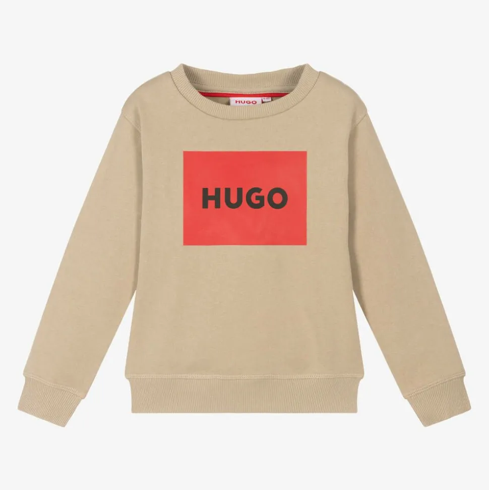 Cool and casual beige crew neck sweatshirt for boys by German label HUGO. Comfortable and easy to wear, it is made in cotton-blend jersey with a soft and fleecy inside. The brand's signature logo stands out in red and black on the front.