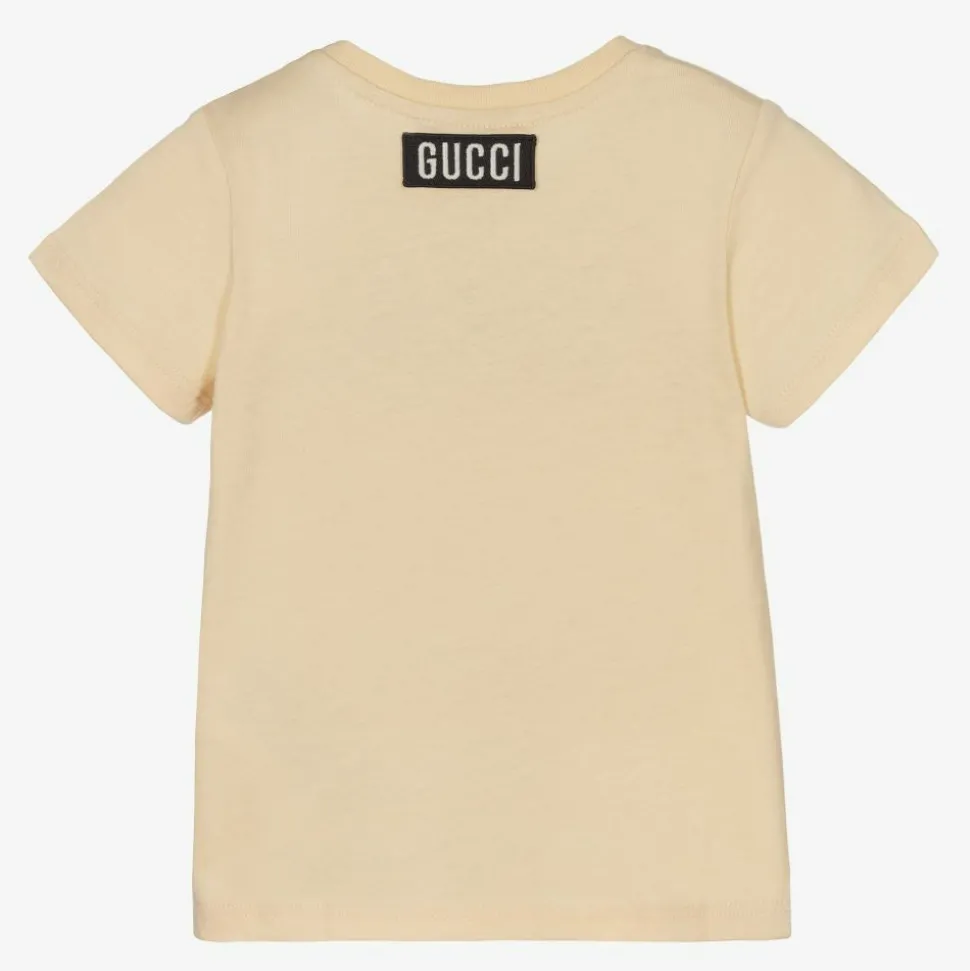 Beige T-shirt for little boys by luxury Italian brand Gucci, made in soft cotton jersey. The front has a green and blue 'Cat-chy' cats print on the front, inspired by the works of 19th century illustrator Louis Wain. There is a black and white Gucci patch on the back, with popper fastenings on one shoulder.