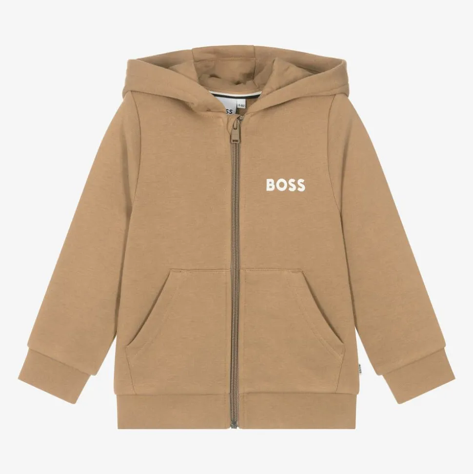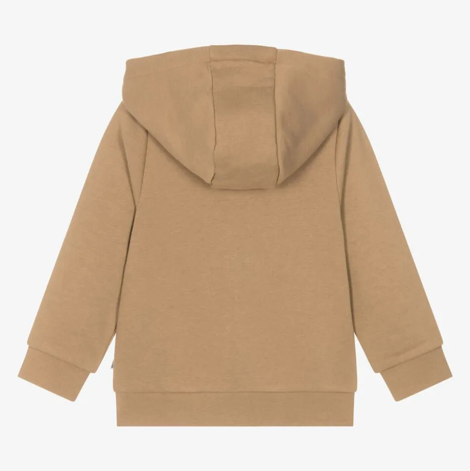 Beige Mini-me zip-up top for boys by German brand BOSS, with a white logo on the chest. Soft and fleecy on the inside, it is made in mid-weight cotton jersey with a cosy hood and two patch pockets on the front. A tonal logo zipper fastens on the front, with a chin guard for extra comfort.