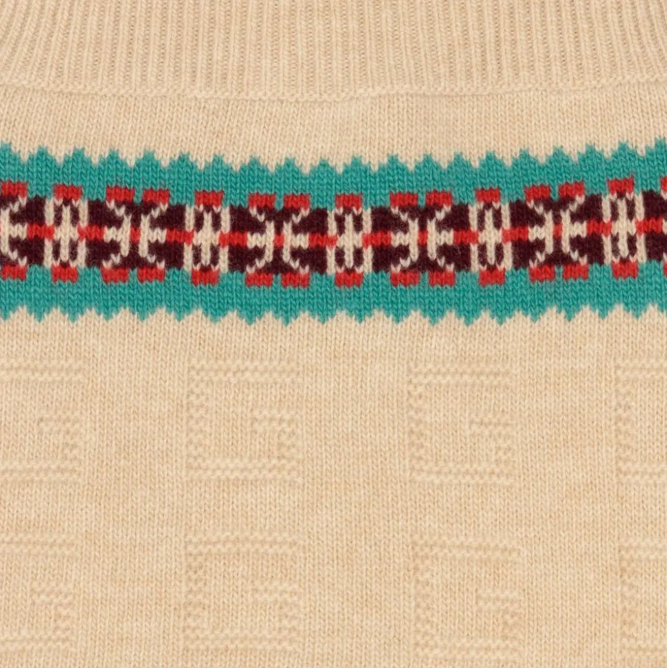 Beige dungarees for little boys by Italian brand Gucci, in collaboration with Angela Lynne, the iconic vintage children's clothing collector. These adorable dungarees trousers have straps which can be adjusted with your little one's growth and the waist and ankles are ribbed for comfort. The instantly recognisable Square G logo is knitted into the trousers and a colour fair isle details on the top catches the eye.