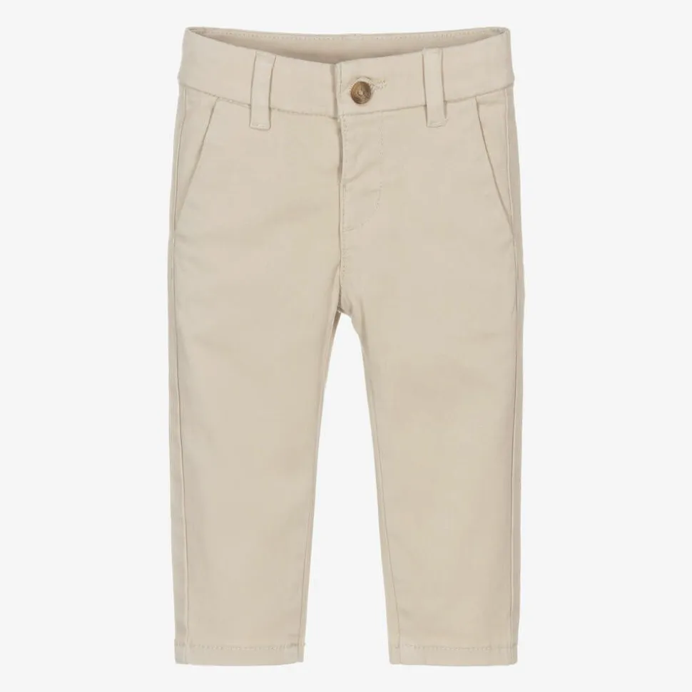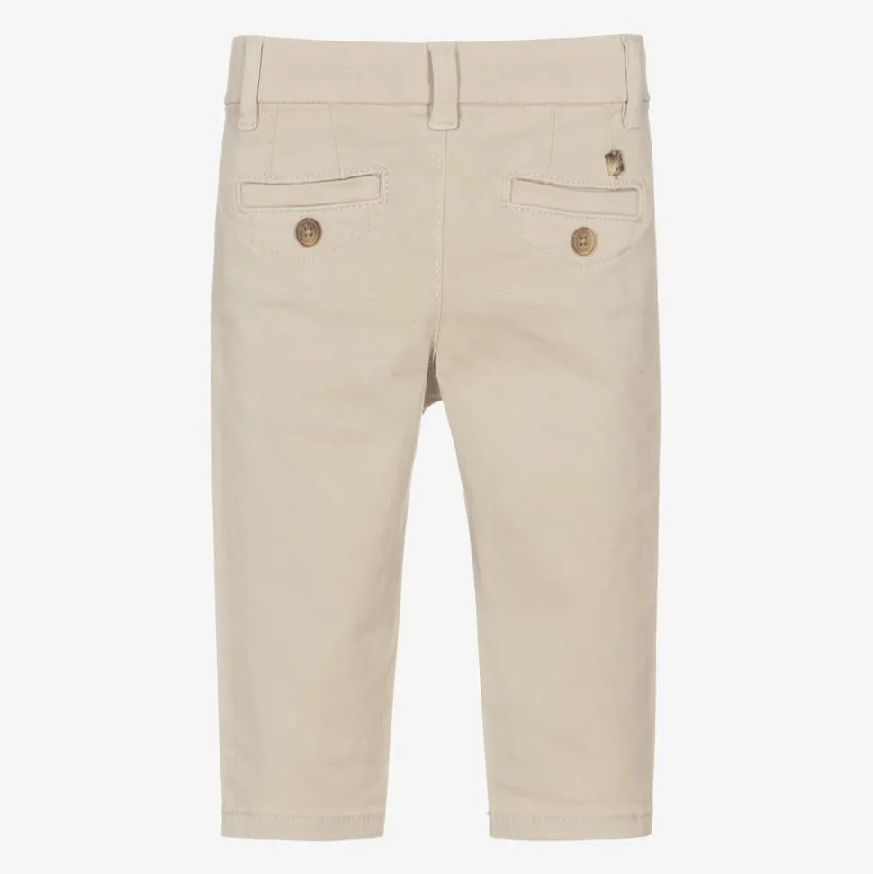 Light beige cotton twill chino trousers for little boys by Spanish brand Mayoral, ideal for smart-casual wear. Slightly stretchy with an adjustable waistband, these slim-fitting trousers fasten on the front with a button. There are slanted front pockets and faux back pockets with decorative button detail.
