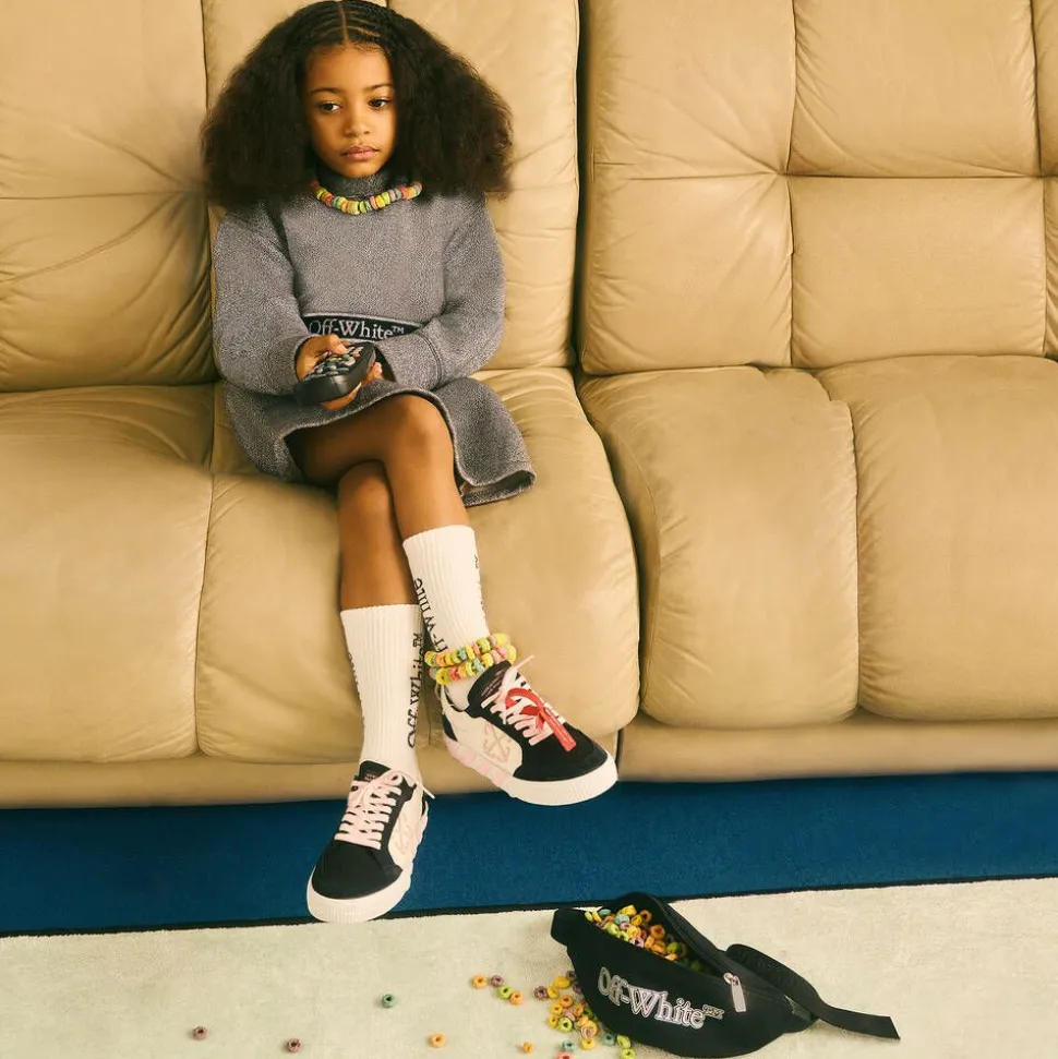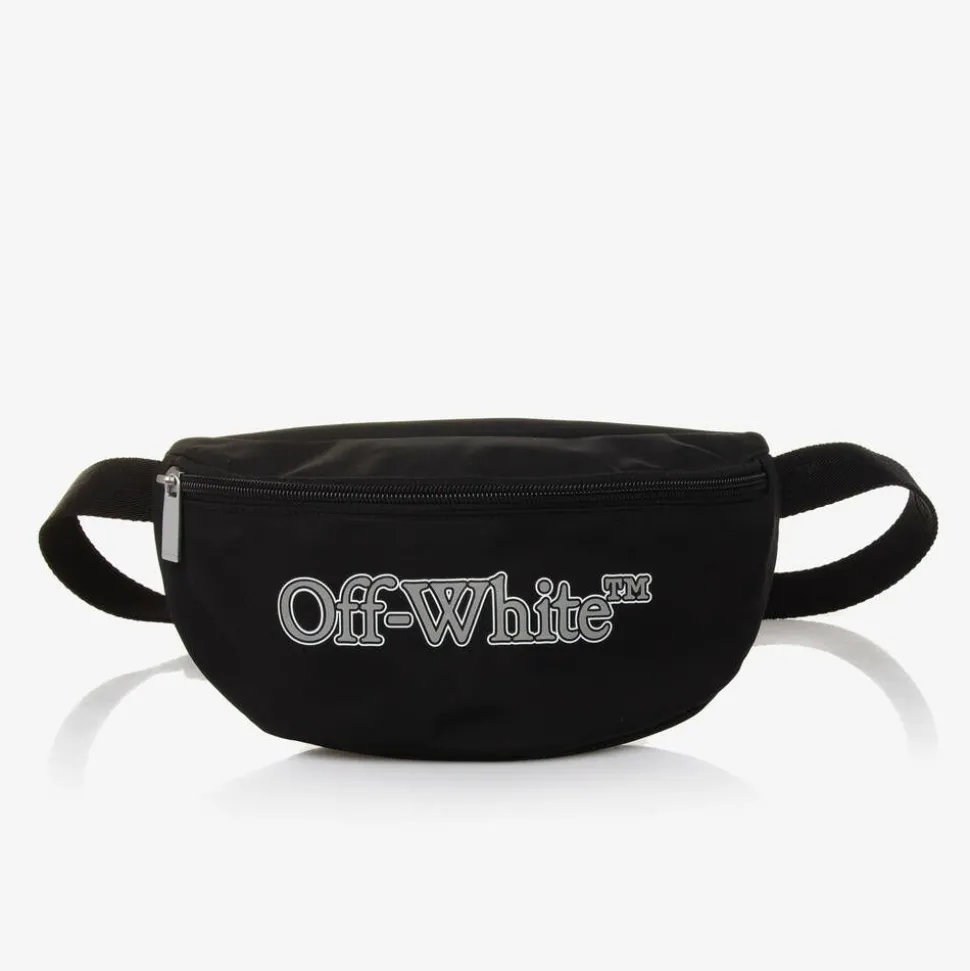 A stylish black belt bag for boys by luxury brand Off-White, boldly branded with a grey bookish logo on the front. For both style and practicality, this zip-up bag is made in silky smooth fabric with a lined compartment. The adjustable webbed strap has jacquard lettering all around and fastens with a black buckle clip.