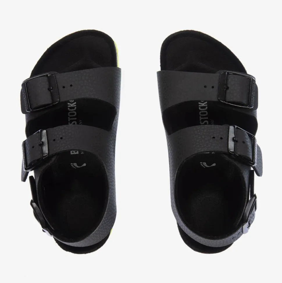 Black sandals for boys by German footwear brand Birkenstock. The straps are made from Birko-FlorĀ® faux leather with three tonal buckle fastenings. Microfiber lined for extra comfort, the anatomically contoured natural cork footbed promotes good walking posture for growing feet. They are finished with a contrast neon green EVA rubber outsole.