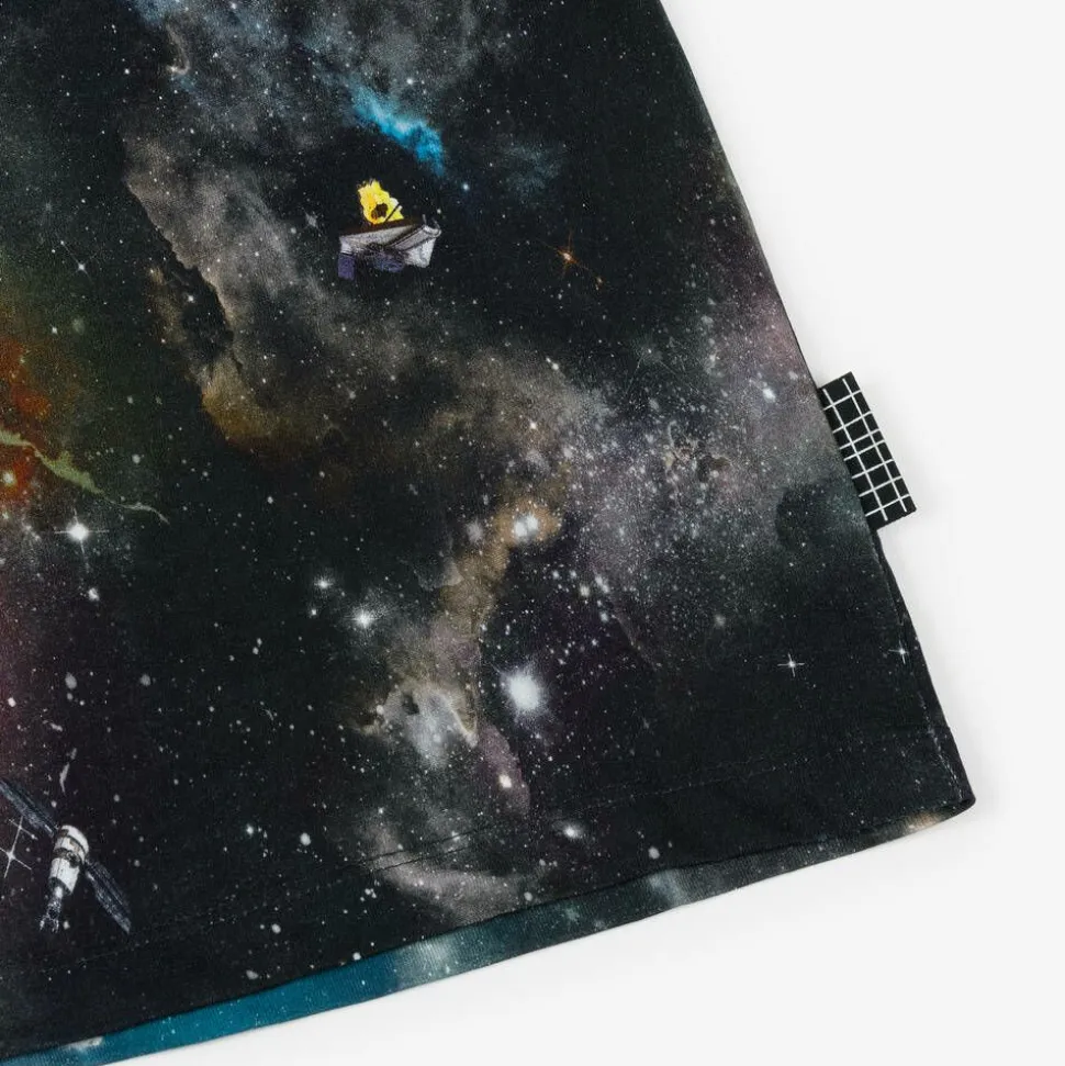 Black organic cotton galaxy print T-shirt for boys by Danish brand Molo. Just right for casual days, it is made in soft, comfortable jersey, with short sleeves and a ribbed crew neck.