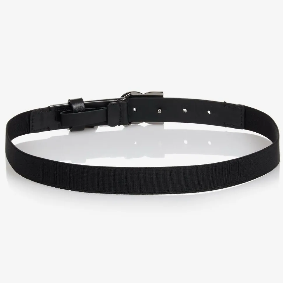 Boys slim black belt by luxury Italian designer Dolce & Gabbana. Great for an everyday smart look, it has a dark silver, metal DG logo pin buckle to fasten on the front. Trimmed with soft and smooth black leather, this belt is elasticated for a good fit.