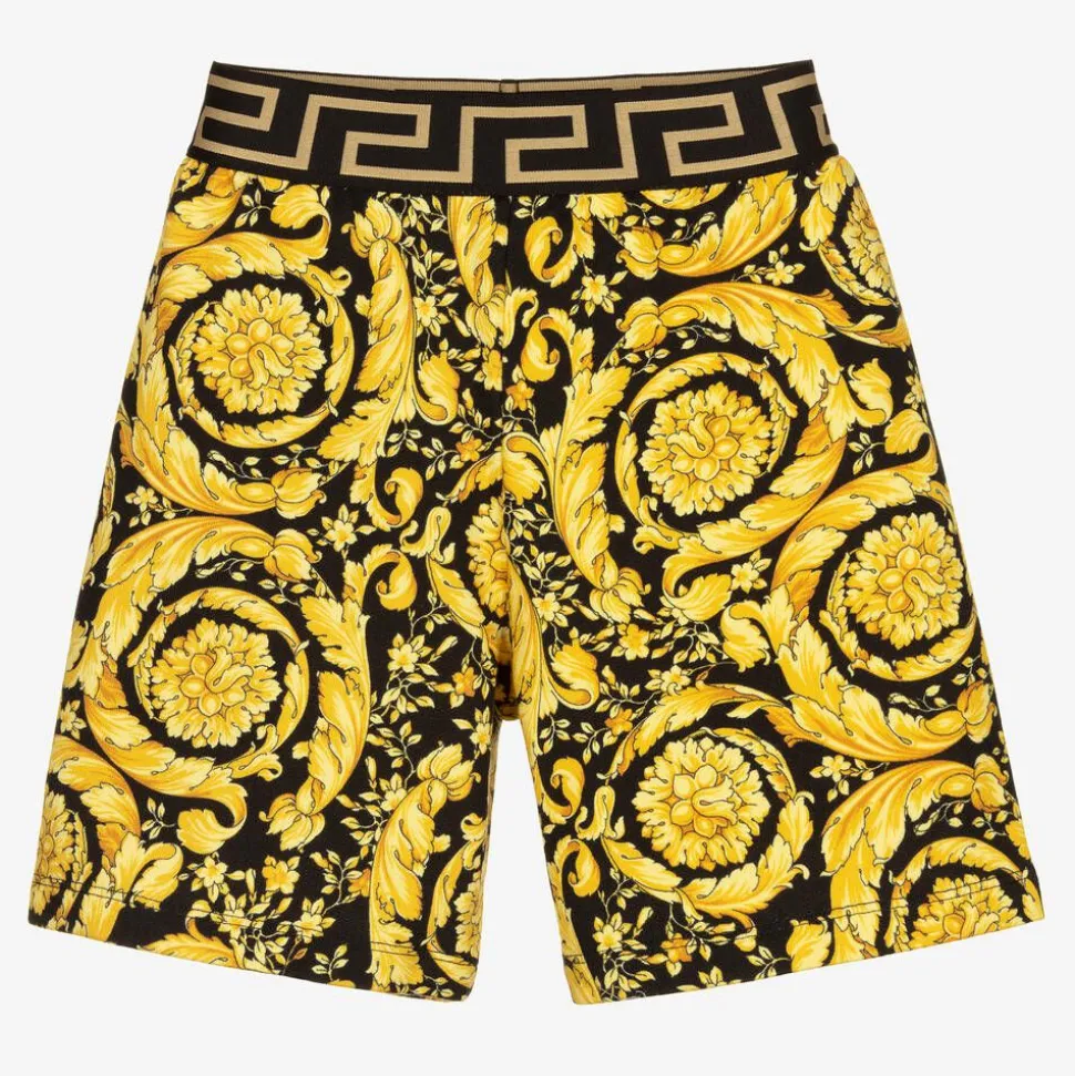 Boys black jersey shorts by Versace, patterned in the luxury brand's gorgeous gold Barocco design. The waistband features Versace's iconic Greca motif in elasticated jacquard. Made from soft, cotton sweatshirt jersey, they are comfortable and have a small pocket on the back.