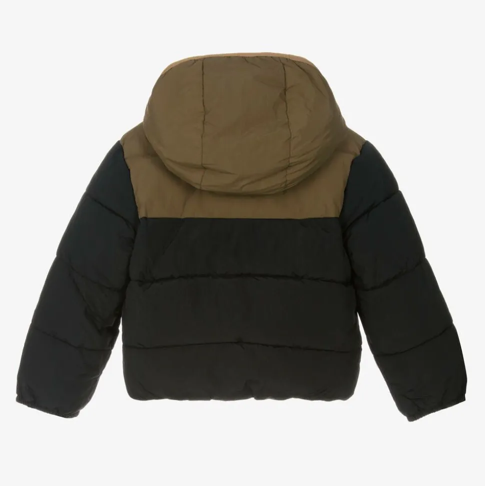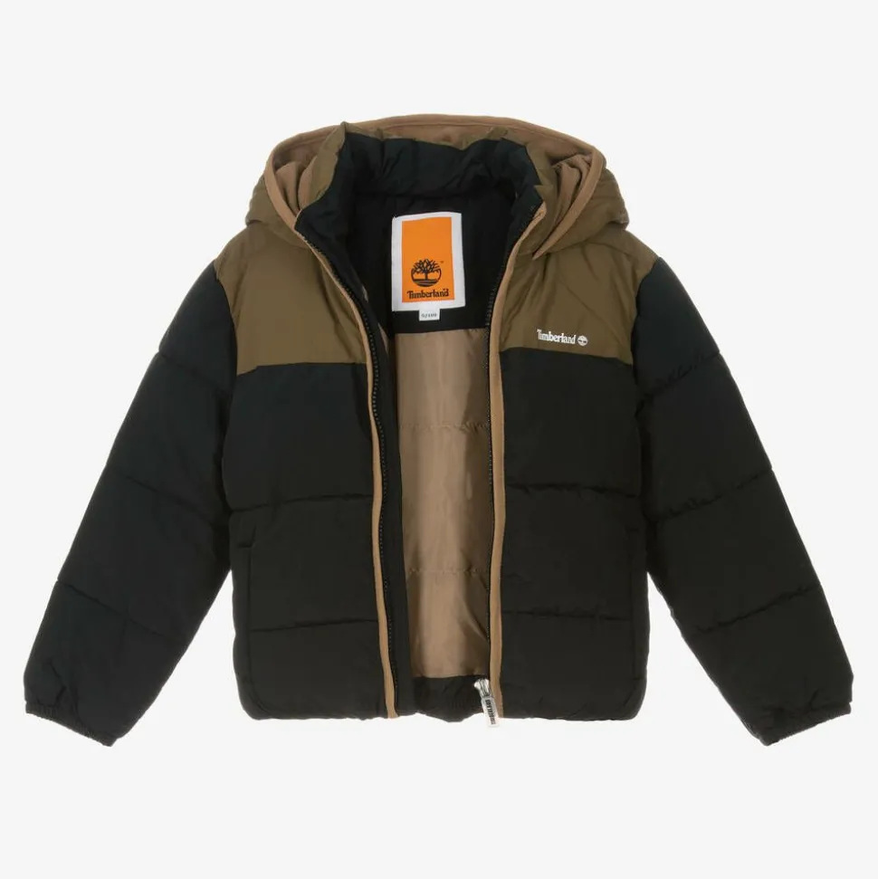 Black and khaki green puffer jacket for boys by Timberland, stamped with the signature tree logo on the chest in white. It has super soft, warm padding, making it ideal for colder days. The hood and front pockets are lined in fleece for extra cosiness. It fastens smoothly with a branded zip on the front. This item contains a minimum of 70% recycled material.