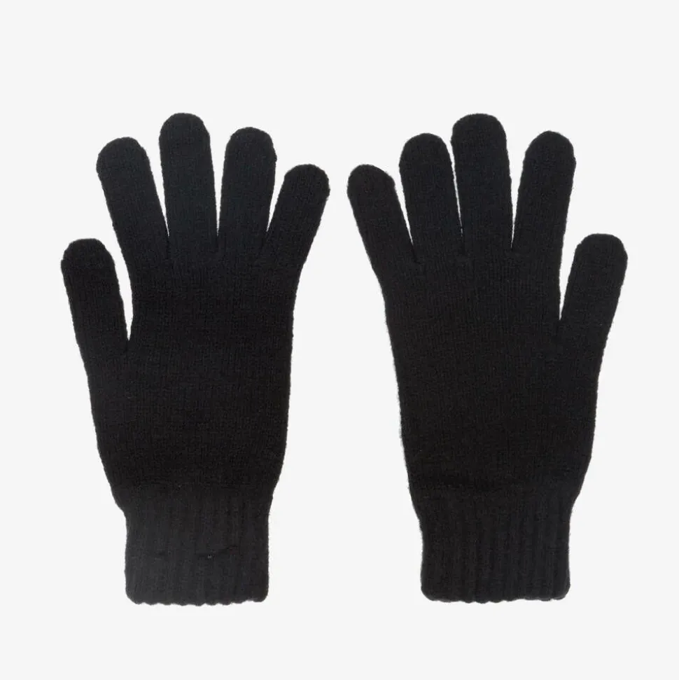 Black gloves for boys by BOSS, knitted in a soft cotton and wool blend. Ideal for providing lightweight warmth, these stretchy gloves have comfortable ribbed cuffs. For unmistakable designer appeal, one glove has a rubberised logo patch on the wrist.