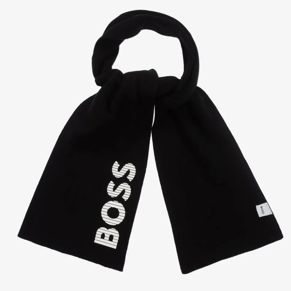 Mini-me black scarf for boys by BOSS, knitted in super soft cotton. Ideal for those cooler days, this warm scarf has a bold, white rubberised logo on one side for an instantly recognisable look.