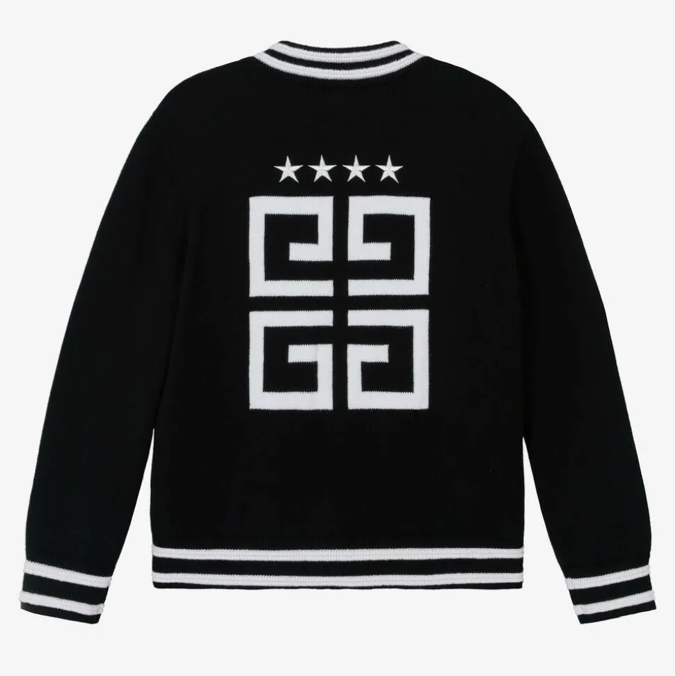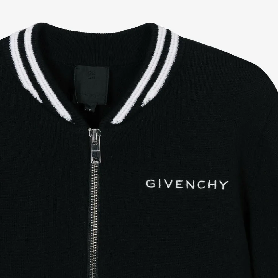 Black Mini-me zip-up top for boys by French fashion house Givenchy, with white striped trims. Beautifully soft and comfortable, it is knitted in a luxurious blend of cotton and cashmere. For brand recognition, there is Givenchy embroidery on the front, with embroidered stars and a large 4G jacquard logo on the back. A branded metal zip puller adds a finishing designer touch.