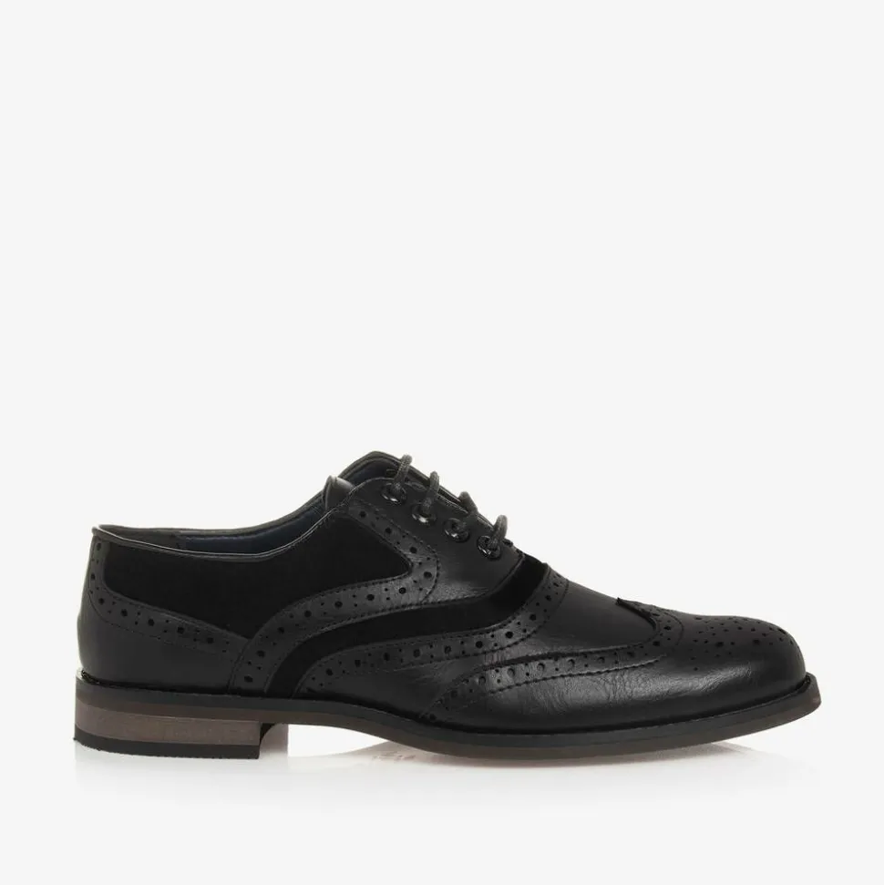 Smart and stylish, these black Mini-me brogues for boys are by House of Cavani. Made and lined in smooth faux leather, they have faux suede trims and perforated detailing for a classic look. With lightly padded insoles, these lace-up shoes have slim rubber outsoles for a sleek finish.
