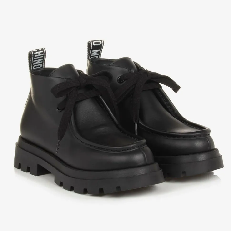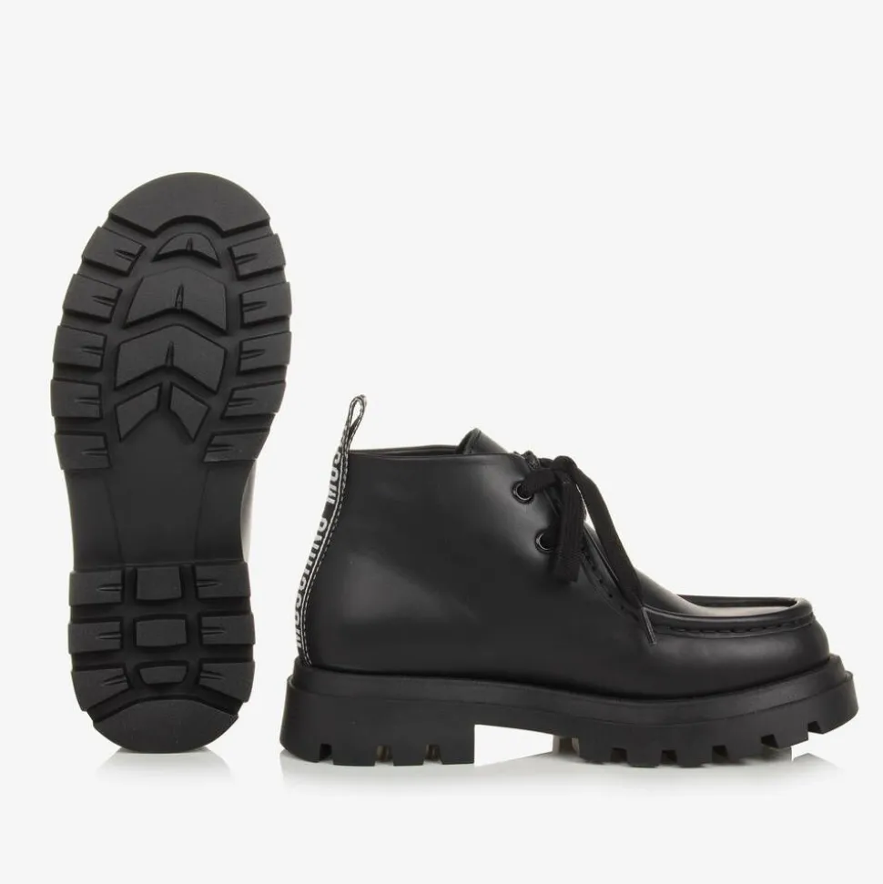 Black leather boots for boys by Italian fashion house Moschino, featuring a moccasin toe design. Lined in smooth leather for comfort, they fasten with laces and have a chunky non-slip rubber sole for good grip. They are trimmed with logo tape on the back of the heel for instant brand recognition.