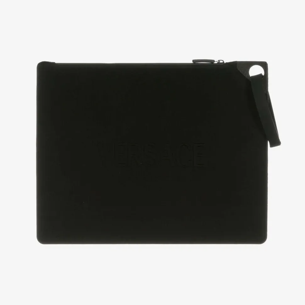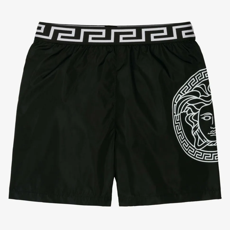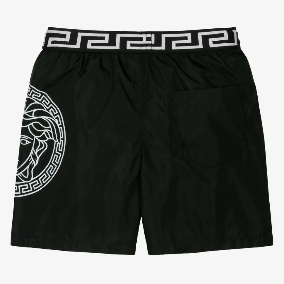 Black swim shorts for boys by luxury Italian fashion house Versace, with a bold white Medusa logo print on one leg. Silky soft and lightweight, they have a soft and stretchy lining and a useful patch pocket on the back. Completing the look with an unmistakable designer touch, the stretchy waistband features the signature Greca motif in white.
