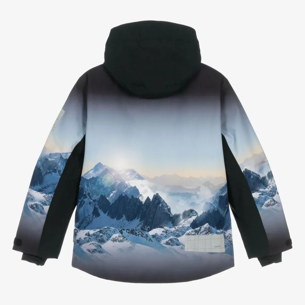 Boys cool blue and black alpine mountain print ski jacket by Molo. With a polar fleece lining and a mesh layer for breathability, it has reflective logo trims, zip-up front pockets and a further ski pass pocket on the sleeve. The large detachable hood has an elasticated trim for a good fit and the stretchy internal cuffs have useful thumb holes. The jacket has a useful chin guard on the zip fastening and an internal popper fastening snow skirt for extra protection. This item contains recycled materials.