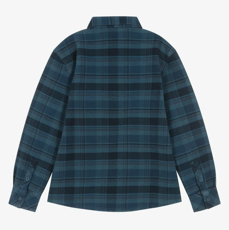 Checked shirt in shades of blue for boys by American brand Timberland. Made in mid-weight cotton twill, it has a patch pocket on the front, with the signature tree logo badge. It has long sleeves and fastens with branded buttons on the front and cuffs.
