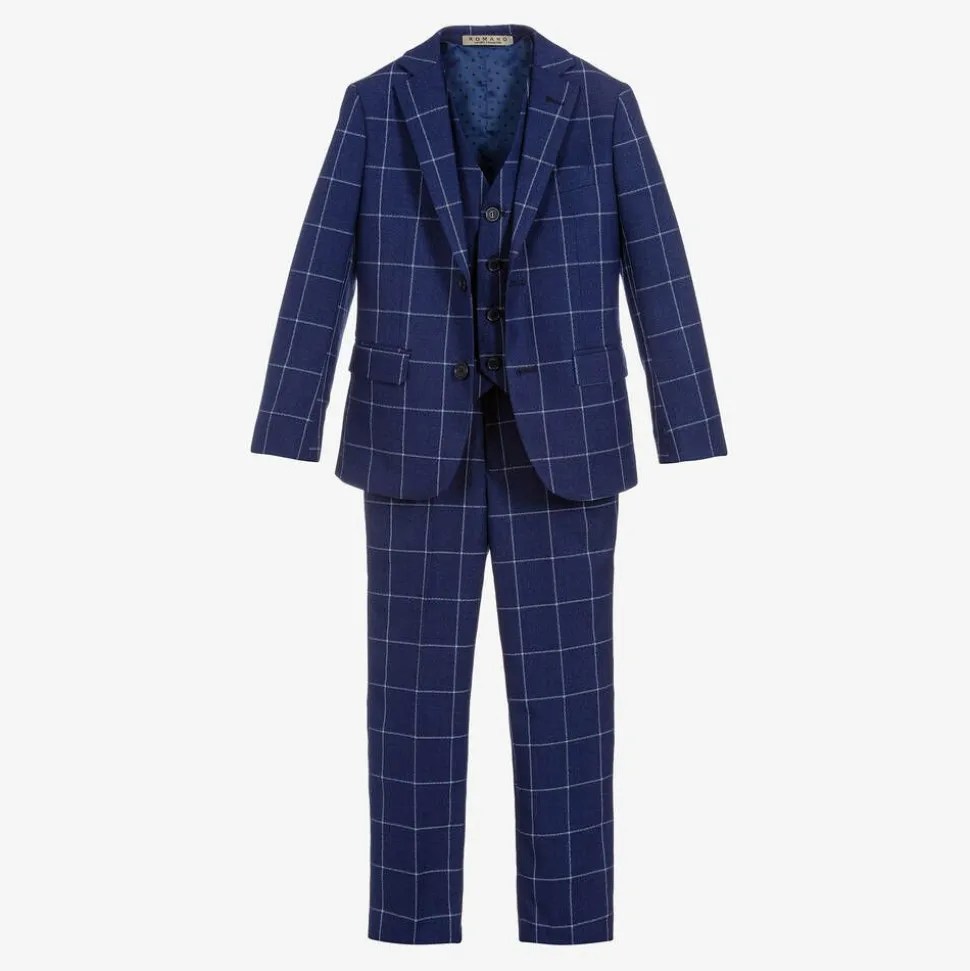 Boys blue check suit by Romano, beautifully tailored in a soft viscose blend fabric, with a slightly sparkly sheen. The jacket is lined in satin with a blue polka dot pattern that matches the back of the waistcoat. Fastening with a button, zip, hook and eye, the coordinating trousers have a comfortable elasticated waist on the smaller sizes.