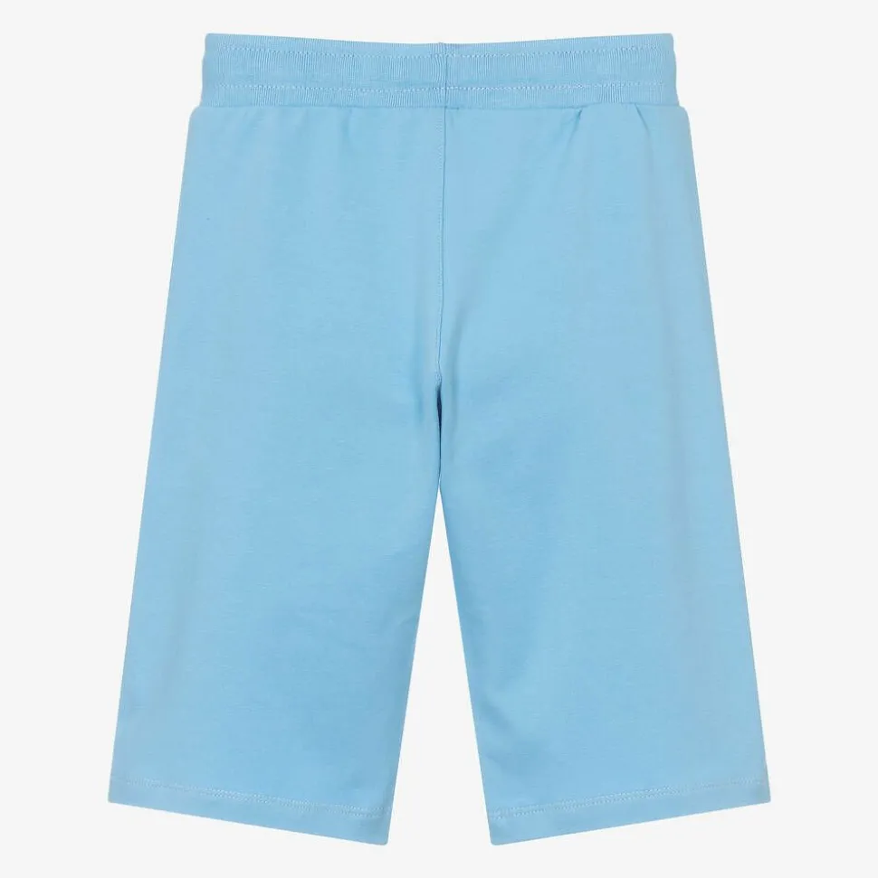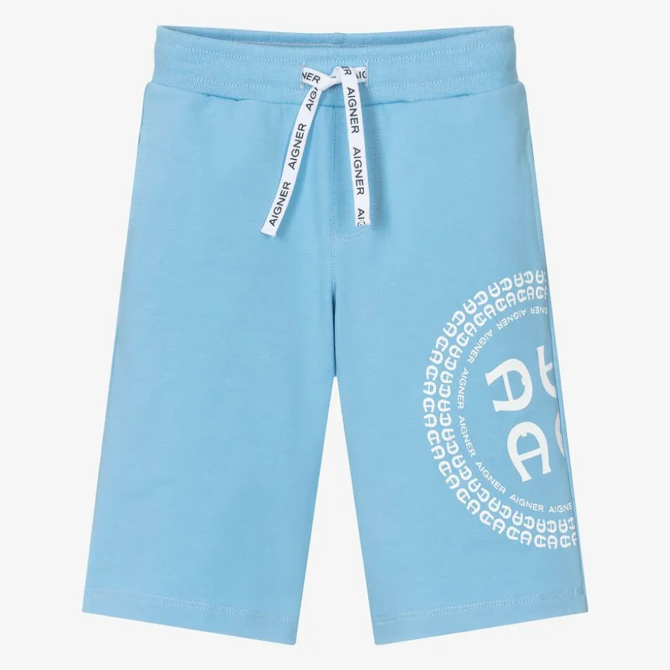 Boys blue shorts from German label AIGNER, made in soft, mid-weight cotton jersey. For designer appeal, the brand's signature 'A' horseshoe logo is printed on the front in a cool, white circular design. Casually styled with useful side seam pockets, they have a stretchy ribbed waistband with branded drawstring ties to ensure a comfortable fit.
