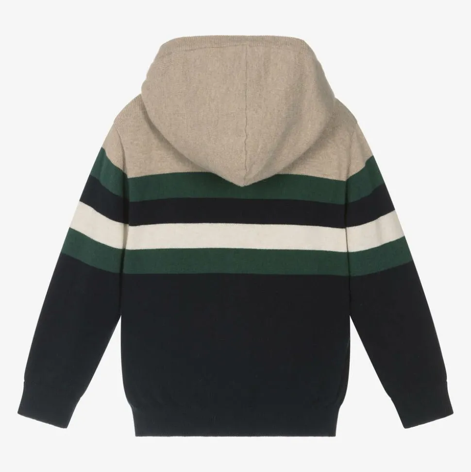 Navy blue and beige zip-up hoodie by Spanish brand Mayoral, knitted in a soft blend of cotton and wool for comfort and warmth. Patterned with green and white stripes across the chest, this casual design has a high neckline, ribbed trims and a double-layer hood. It fastens neatly on the front with a branded zip.