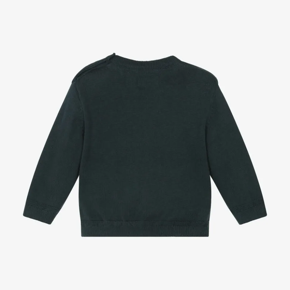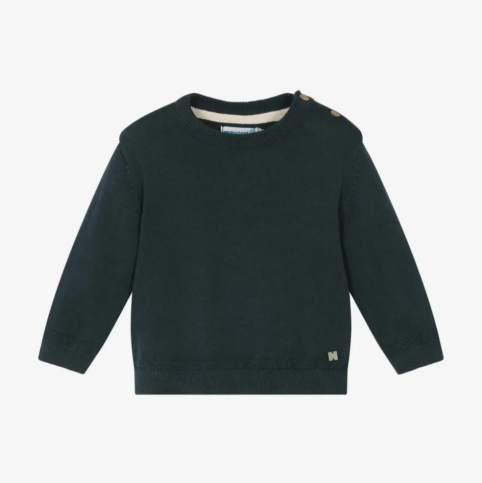 A lightweight navy blue sweater for little boys by Mayoral, made in a soft cotton knit. It has delicately patterned trim around the cuffs and hemline, with a small logo charm stitched near the hem. There are wooden button fastenings on one shoulder to help with dressing.