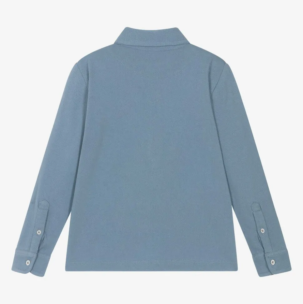 Blue long-sleeved polo shirt for boys by Mayoral, made in soft cotton piqué. This everyday style has button fastenings on the front and cuffs, with a tonal 'M' embroidered on the chest for a discreet, branded sign off.