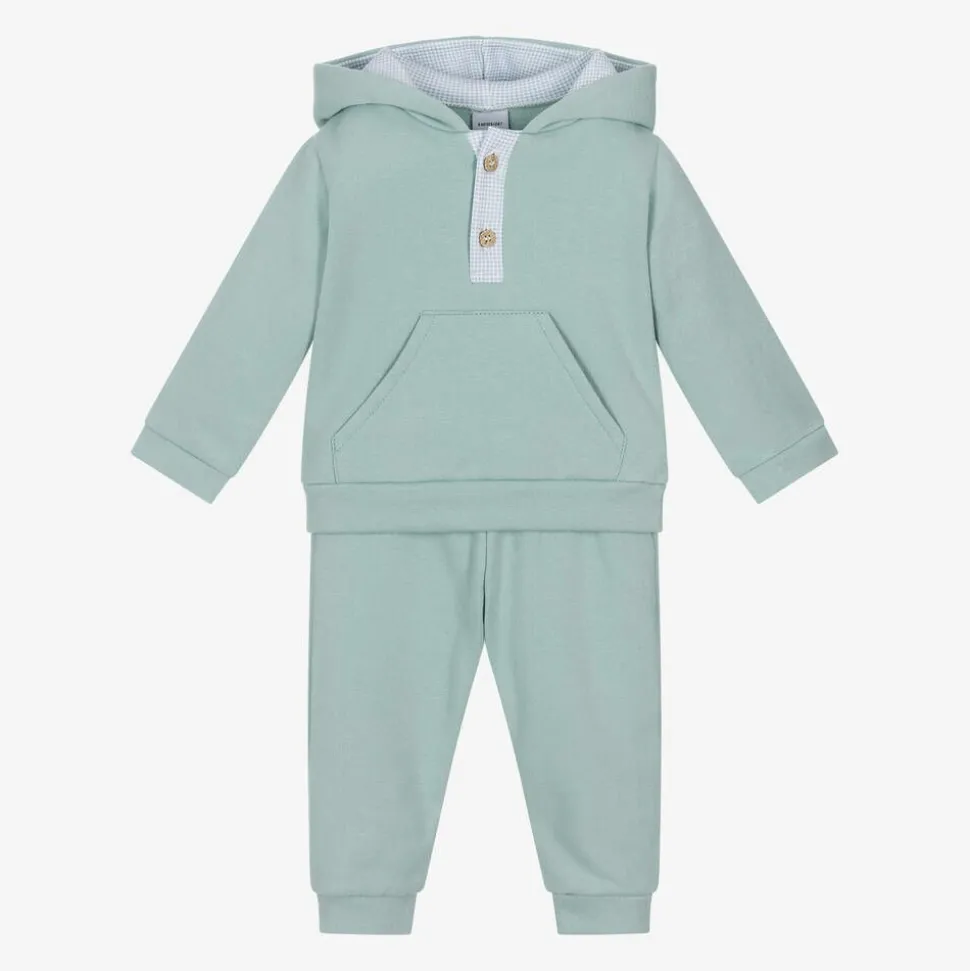 Mist blue tracksuit for younger boys by Babidu, comfortable in soft, stretchy and mid-weight cotton jersey. The hoodie has natural button closures on the front, gingham accents, and a pouch pocket. Easy to dress and change your little one, the cuffed joggers have an elasticated waist.