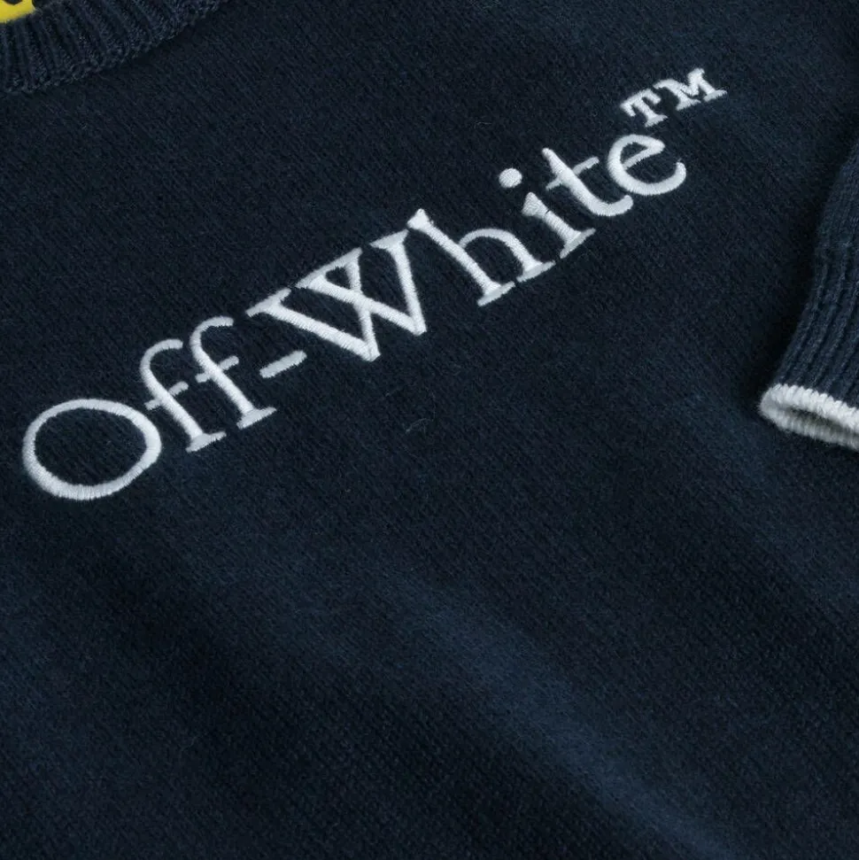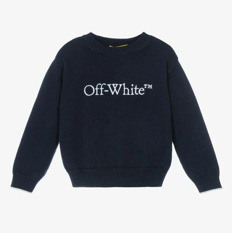 Navy blue sweater for boys by contemporary luxury brand, Off-White. Knitted in a soft cotton and wool blend, this cosy layer is simple and understated. It is embroidered with the iconic Bookish logo on the front in white for instant designer appeal.