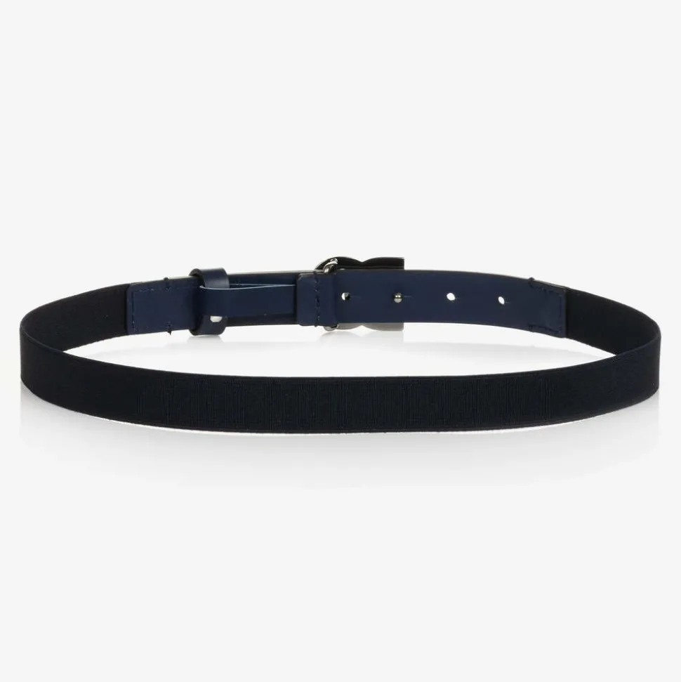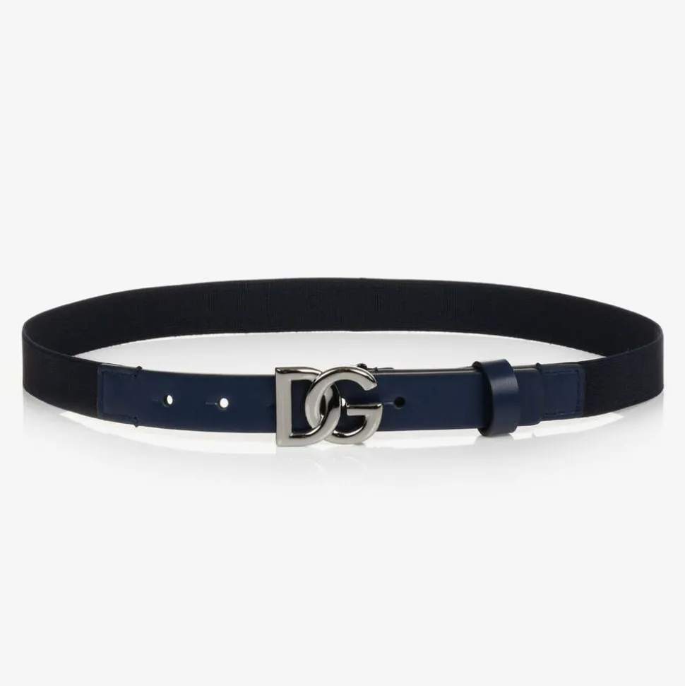 Boys slim navy blue and black belt by luxury Italian designer Dolce & Gabbana. Great for an everyday smart look, it has a dark silver, metal DG logo pin buckle to fasten on the front. Trimmed with soft and smooth navy blue leather, this belt is elasticated for a good fit.